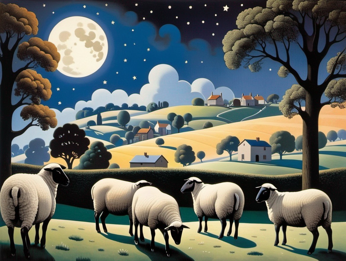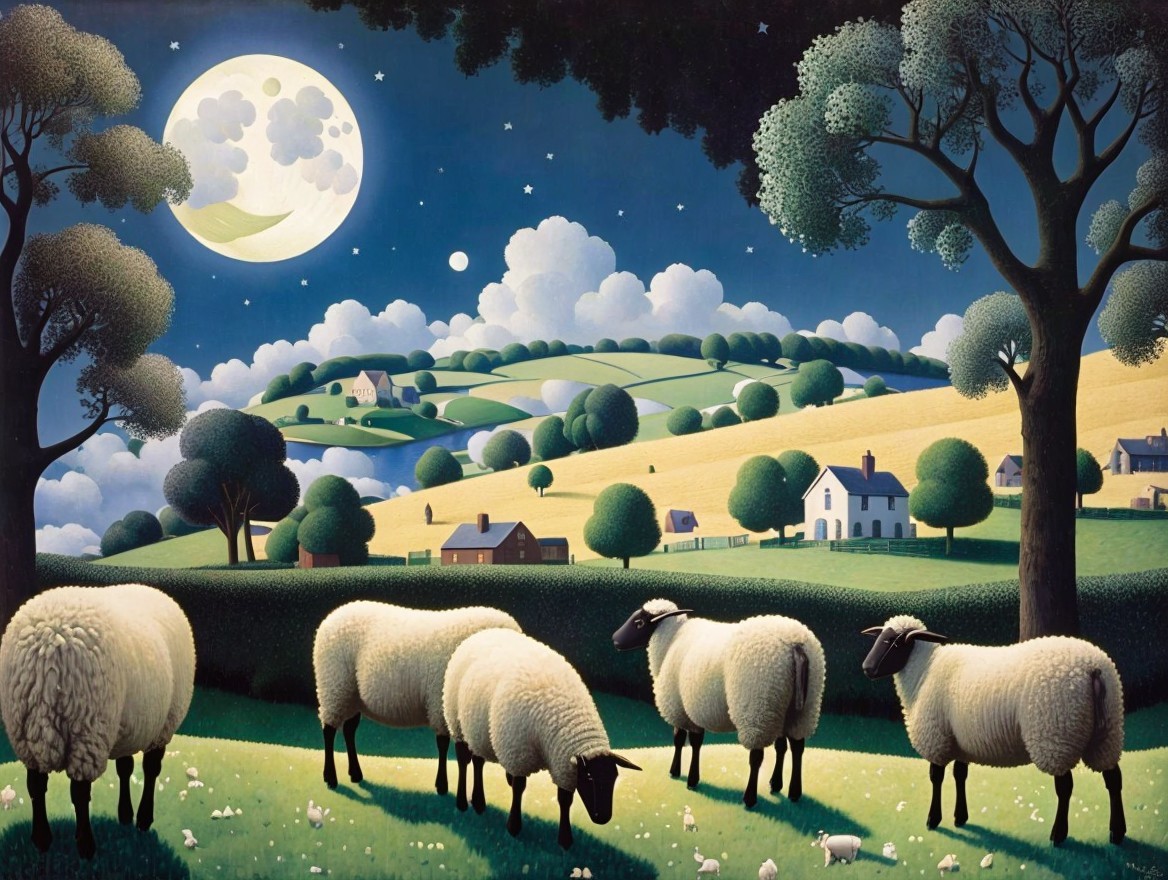 A whimsical painting of sheep before rolling hills under a night sky with a large full moon and stars.