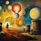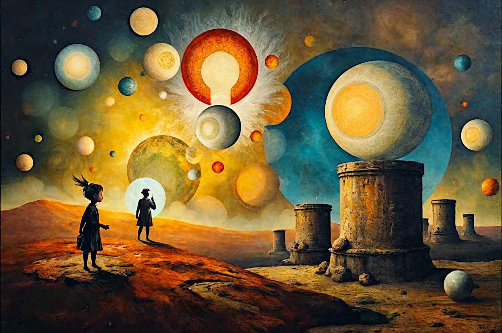 Two children stand on a surreal, rocky landscape, gazing at vibrant, oversized celestial orbs in the sky, surrounded by mysterious pillars. The scene conveys wonder and interstellar exploration.
