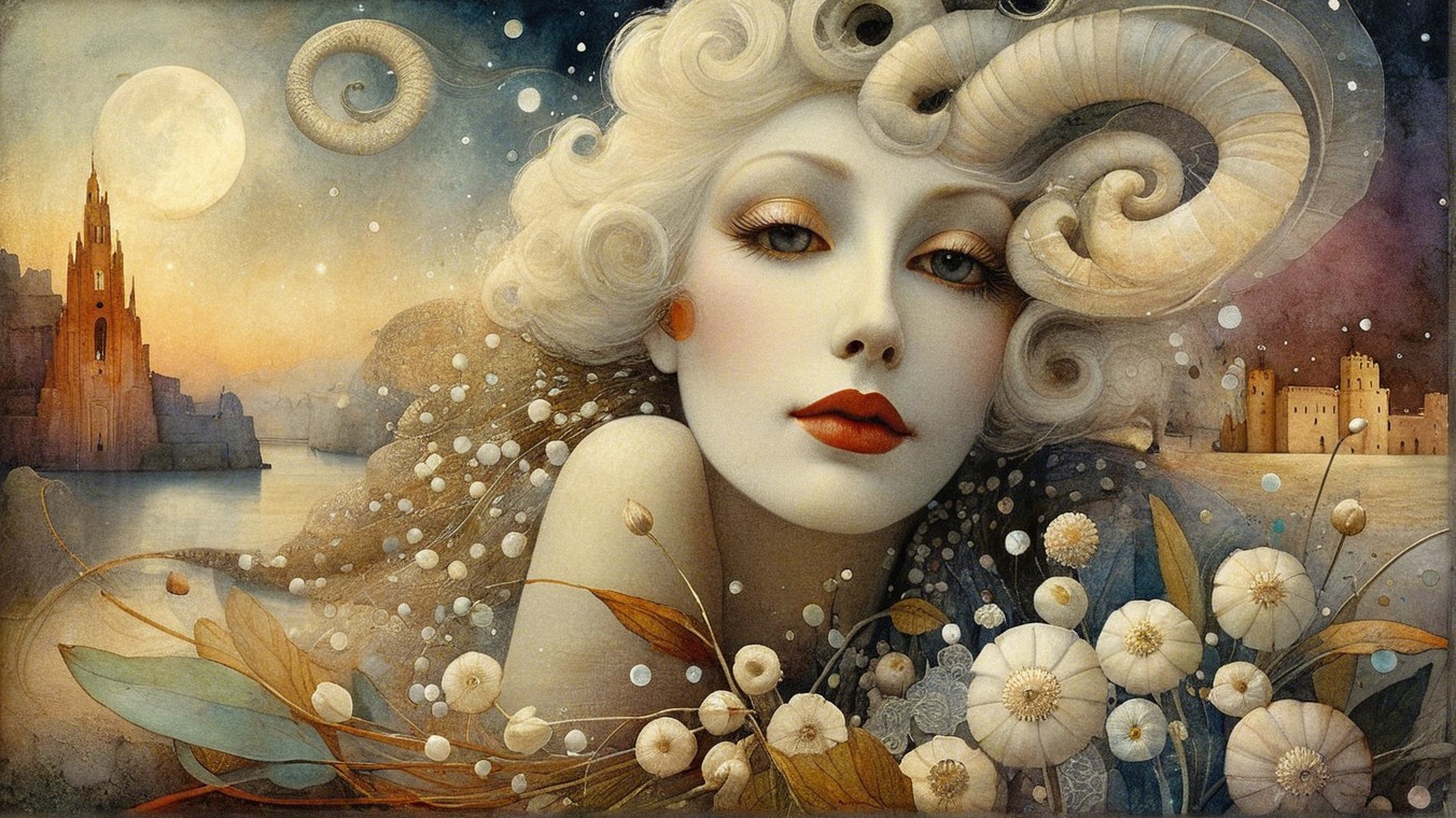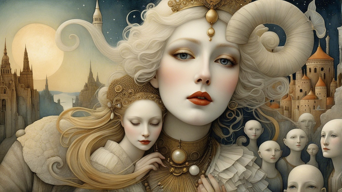 A serene, ethereal figure with flowing white hair and jeweled adornments gazes thoughtfully. A mystical cityscape and pale, faceless figures surround her, creating a hauntingly beautiful atmosphere.