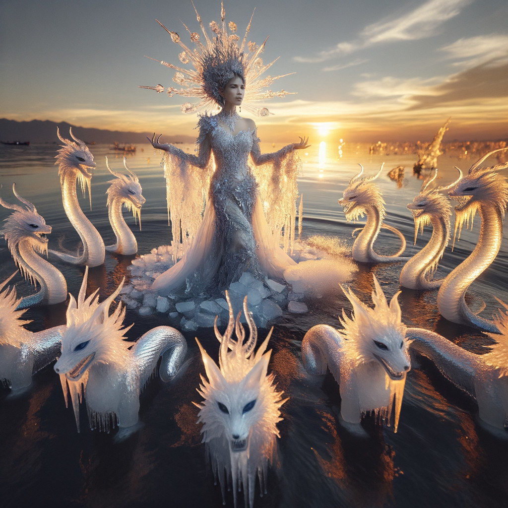 An anime-style woman in a blue dress stands on ice surrounded by foxes with a sunset and mountains in the background.