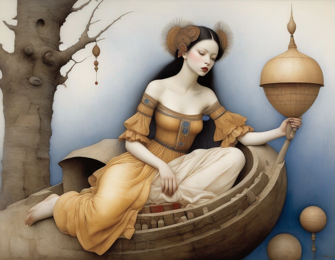Stylized woman in elegant, earthy attire sits in surreal setting with tree and hot air balloon