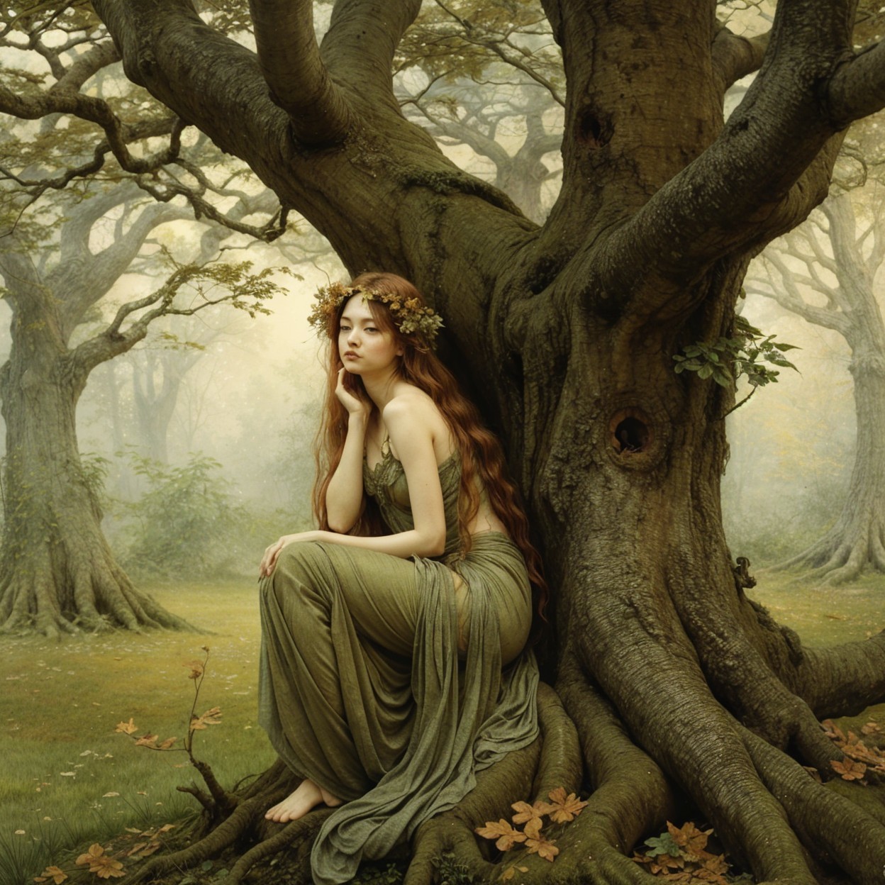 A serene woman with long, flowing red hair sits against an ancient tree in a misty forest. Her green gown blends harmoniously with nature, evoking a mystical and ethereal atmosphere.