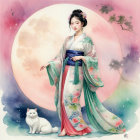 A woman stands against a large moon backdrop, her back partially turned. She drapes a flowing, pale blue garment, adorned with floral patterns, creating a serene and artistic atmosphere.