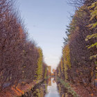 A vibrant landscape features autumn trees with swirling orange and yellow leaves, reflecting in a calm river. The scene is illuminated by a radiant sun, creating a magical, dreamlike atmosphere.