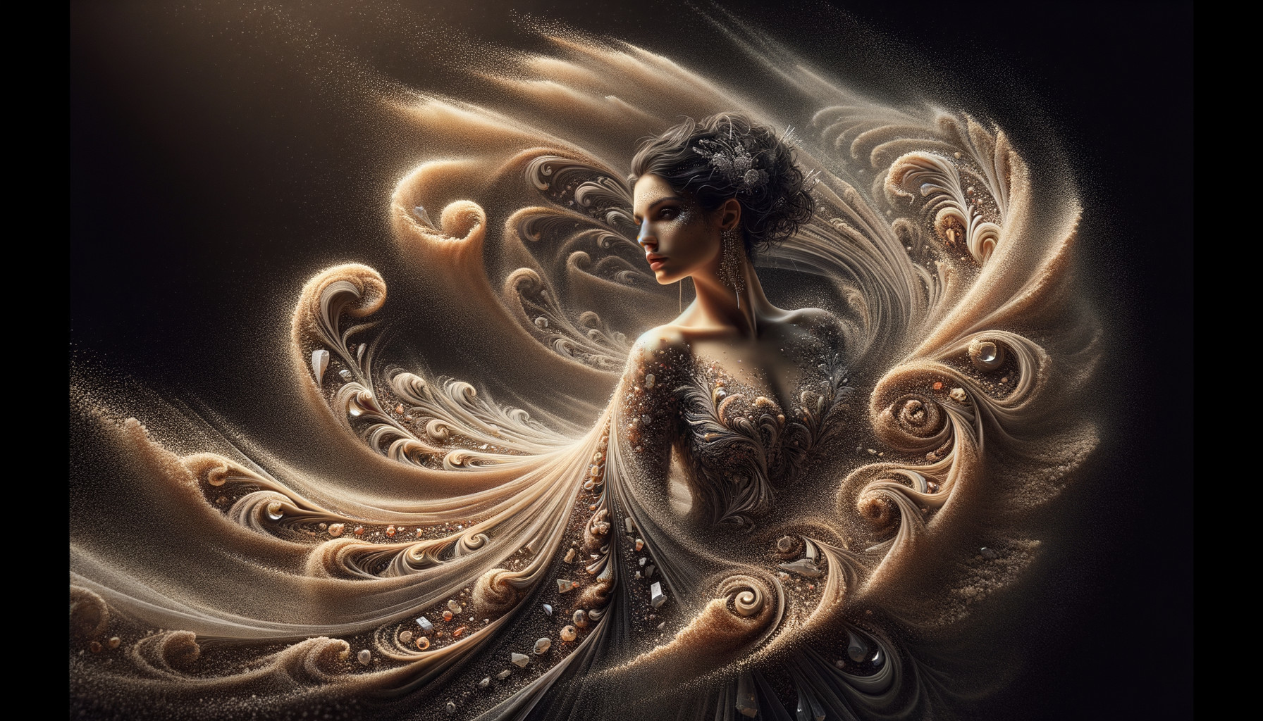 I've always been captivated by the beauty and fluidity of women in dresses crafted from unconventional media. My latest creation features a stunningly imaginative close-up of a flamenco dancer, wrapped in a dress made entirely of intricately designed sand particles. This surreal vision captures the elegance of a sandstorm, where the wind acts as an artist, using watercolor, fine crystal dust, and sand particles to paint the scene.
