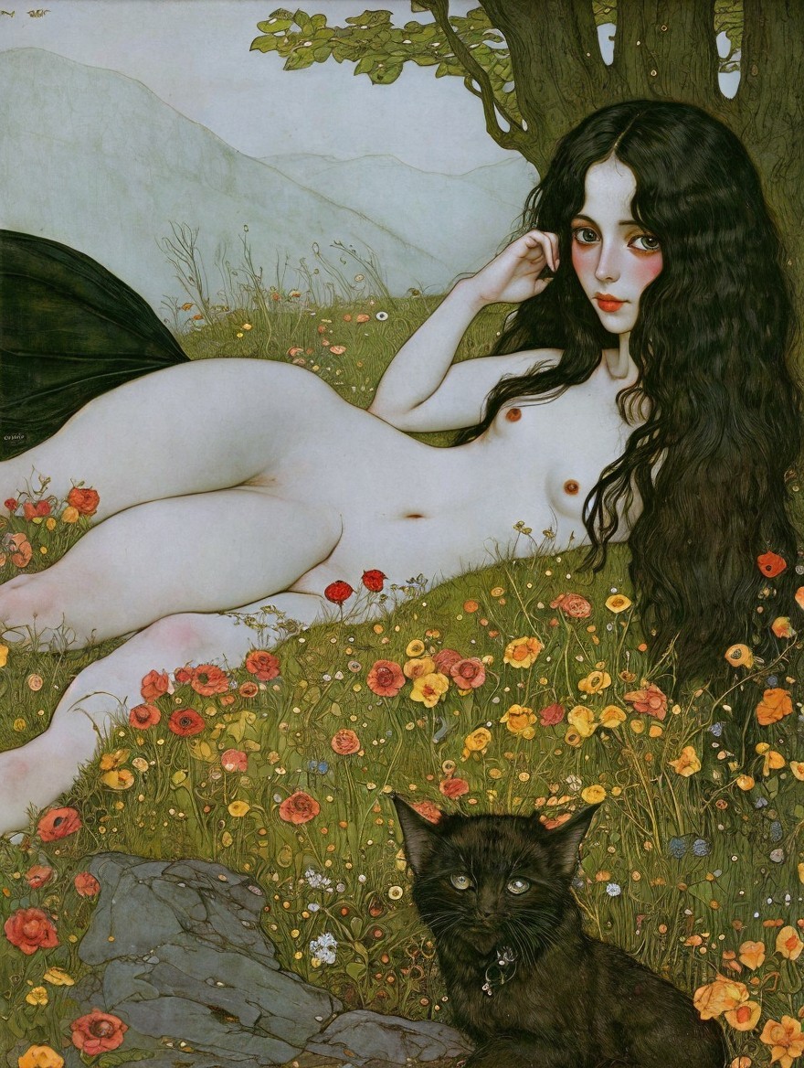 An illustration of a woman in a golden dress sitting by a tree, gazing at a moonlit mountainous landscape.