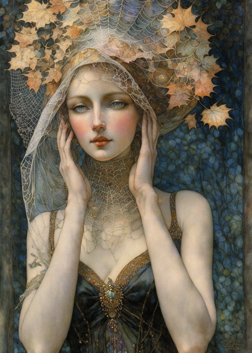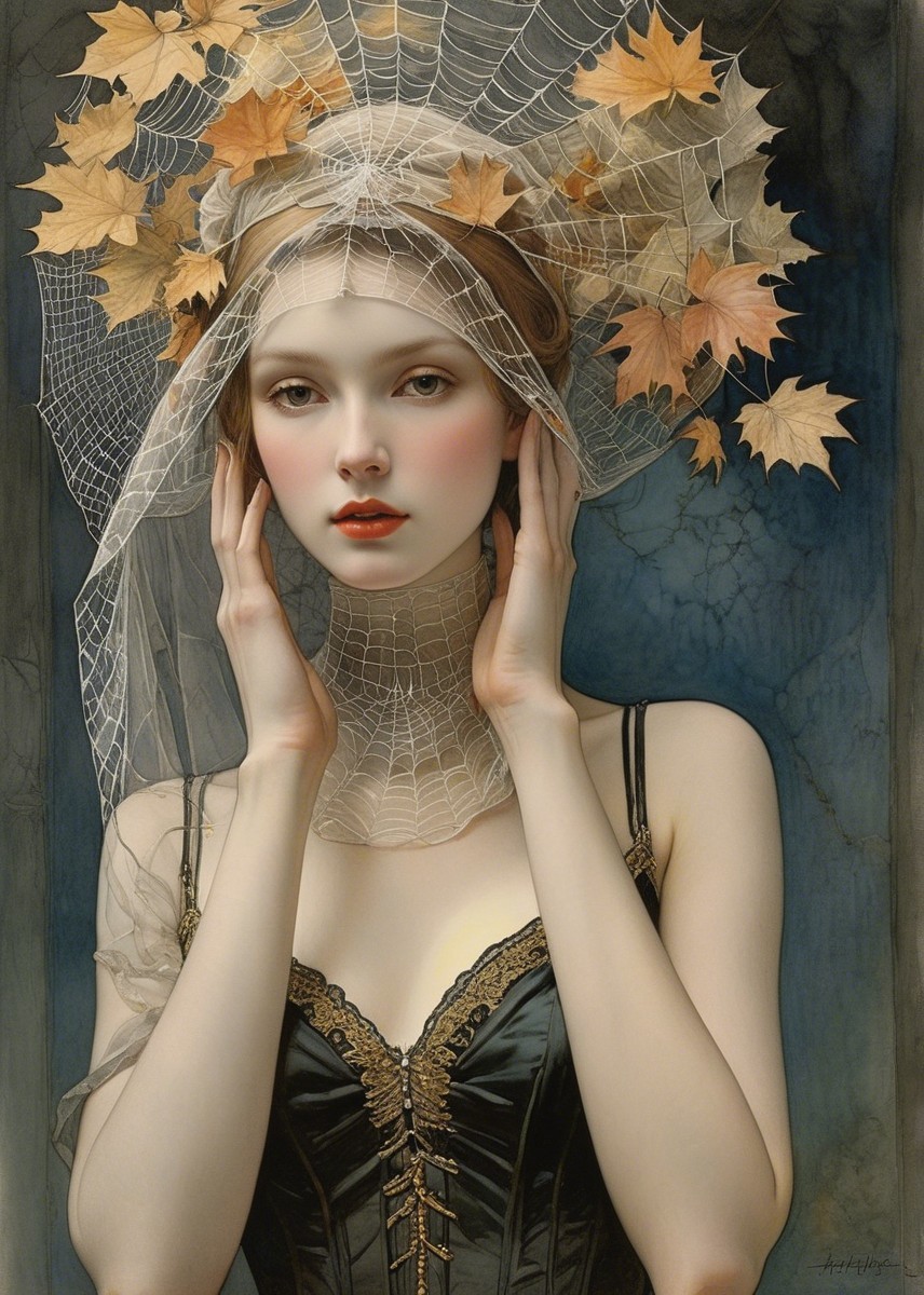 A young woman with golden hair, adorned in a green dress, gently touches her face. She wears a delicate veil decorated with leaves and a spider web, evoking a mystical, autumnal atmosphere.