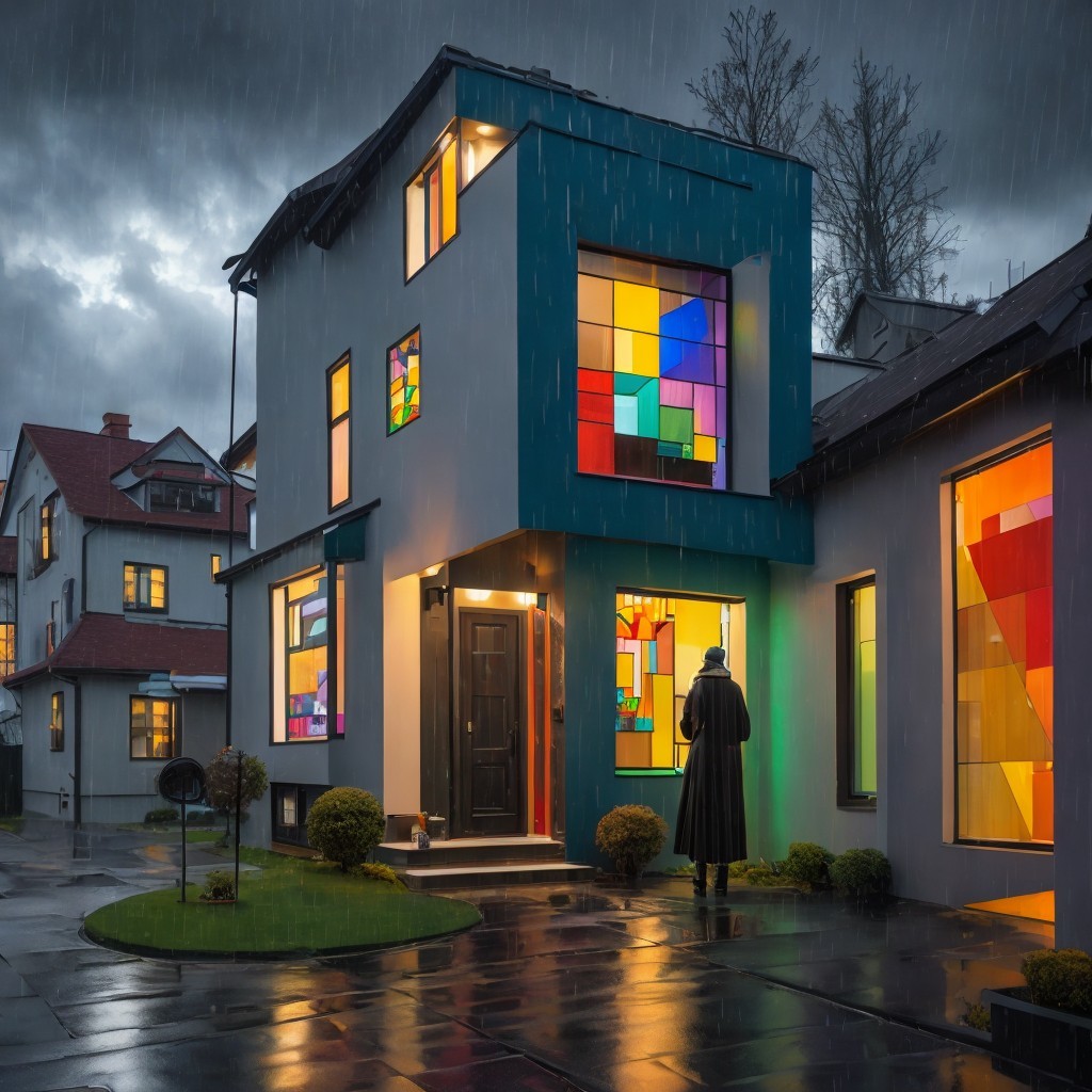 A person in a coat stands before a modern house with colorful stained glass windows, illuminated at twilight under a rainy sky.