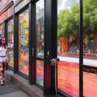 A stylish figure in a white outfit walks past a glass storefront, revealing vibrant red decorations and lush greenery. The urban setting contrasts modern design with natural elements.