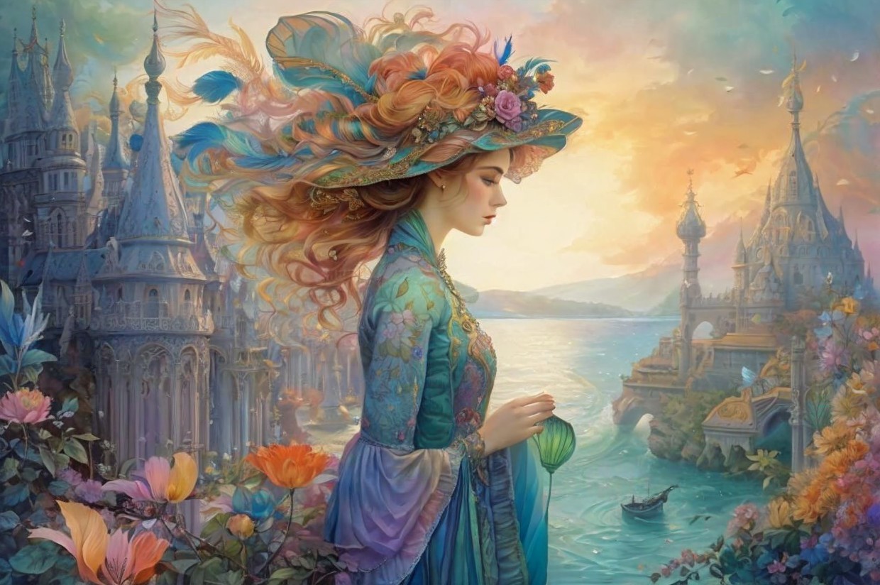 A fantastical painting depicts a young woman in profile view, facing left, standing in the foreground. She wears an elaborate hat adorned with vibrant feathers, leaves, flowers, and other decorative elements in shades of blue, pink, orange, and green. Her long, flowing hair transitions from golden brown to soft amber hues, blending seamlessly with the surreal surroundings. The woman's attire consists of a detailed, ornate dress in teal and light blue hues, featuring intricate swirling patterns and designs that extend into the midground. The dress has wide, flowing sleeves and a high collar. She holds a translucent, spherical object with both hands, her expression serene and contemplative. In the background, fantastical architectural structures dominate the scene, including spires, domes, and intricate towers rendered in soft blue and gray tones. A body of calm water reflects the warm hues of the setting sun, with a small boat carrying two figures floating near the coastline. The sky transitions from warm amber yellow near the horizon to soft blue higher up, with scattered clouds adding depth and texture. The foreground is filled with whimsical flora, including large, colorful flowers in pastel shades of peach, pale yellow, orange, pink, lavender, and white. The overall mood is dreamlike and ethereal, with soft, diffused lighting enhancing the surreal quality of the scene. The color palette ranges from cool blues and greens to warm oranges and yellows, creating a harmonious blend of fantasy and tranquility. The composition is balanced, with the central figure drawing attention while the intricate details of the surroundings complete the fantastical atmosphere.