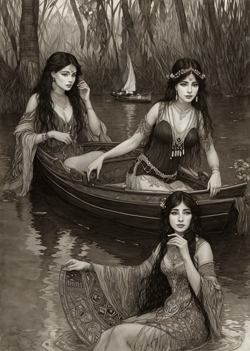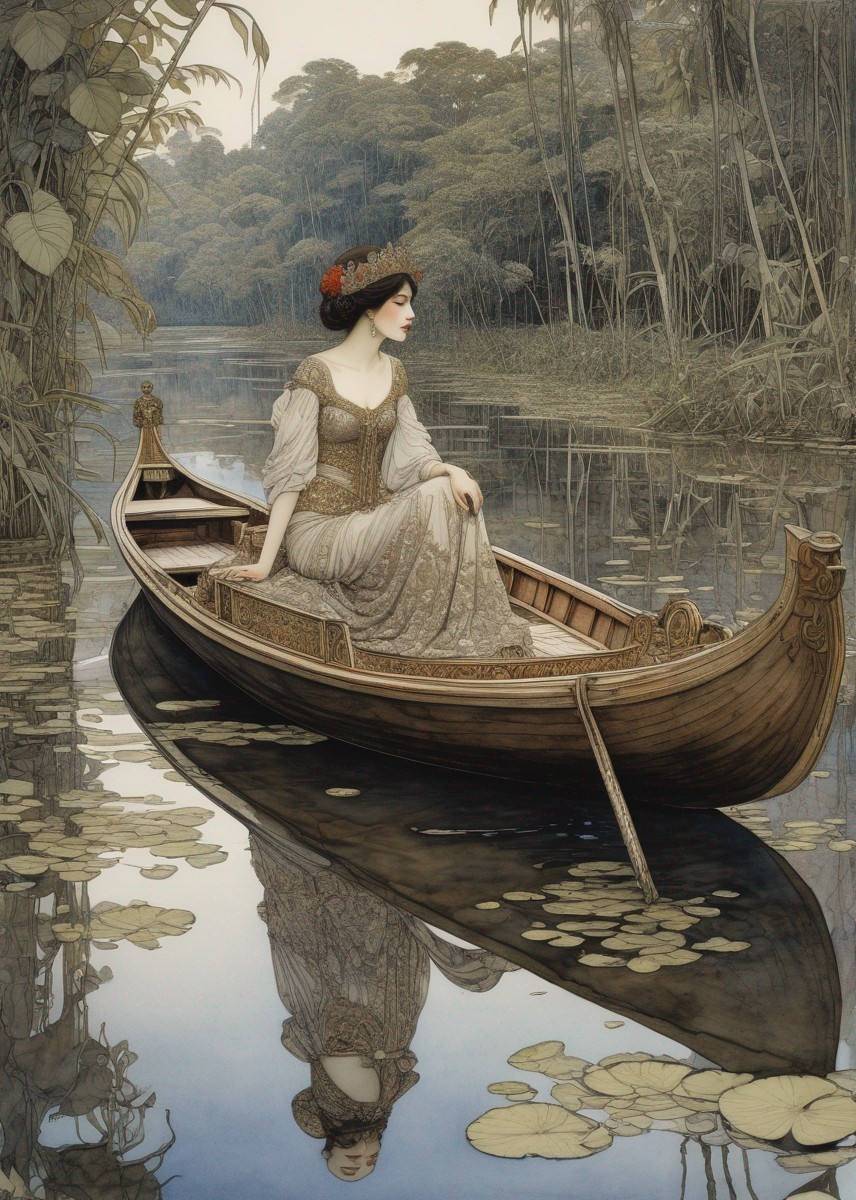 An ethereal woman in a white dress sits in a wooden rowboat surrounded by tranquil water and lush greenery, exuding a serene ambiance.