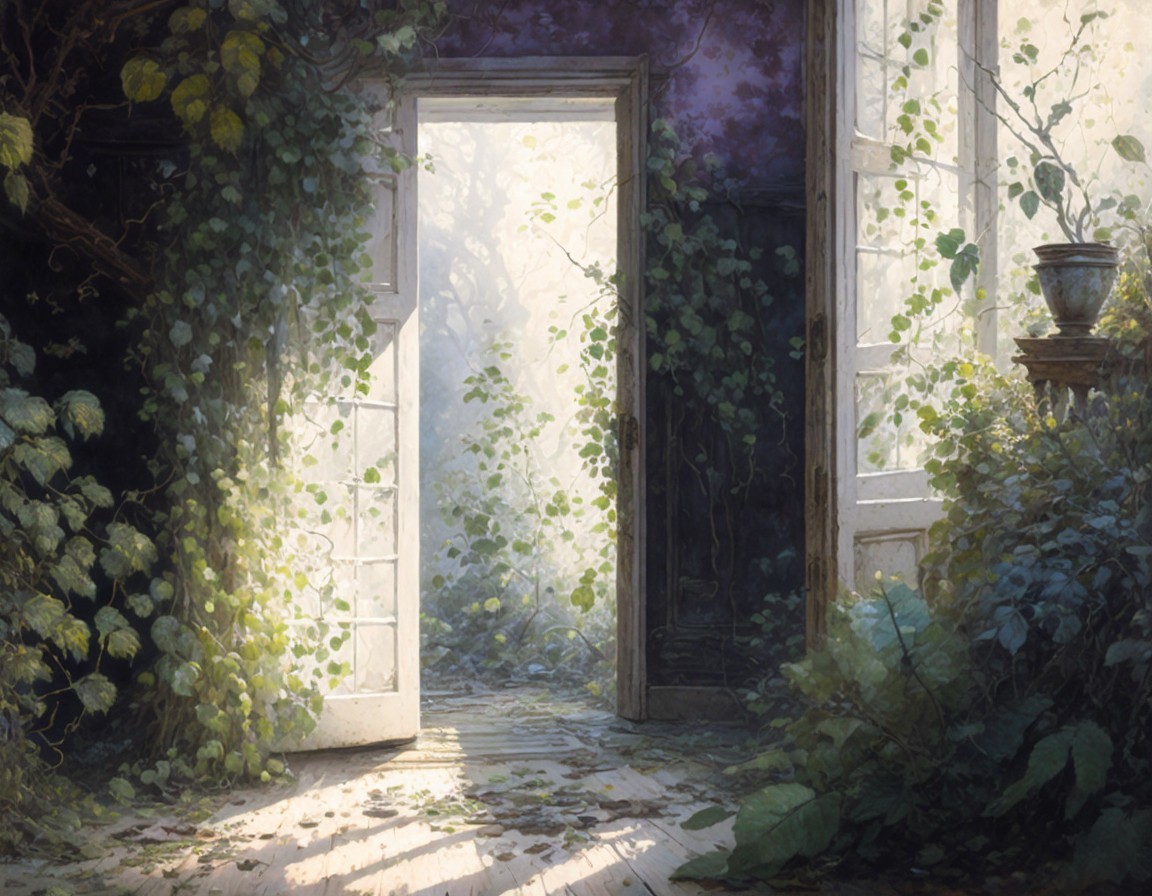 An overgrown room with sunlight streaming through an open door, vines and greenery encroaching from a lush garden outside.