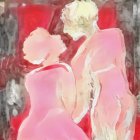 The image features two elegantly styled women in pink garments, exuding an intimate moment. Their poses reflect tenderness, set against a bold backdrop with geometric shapes.