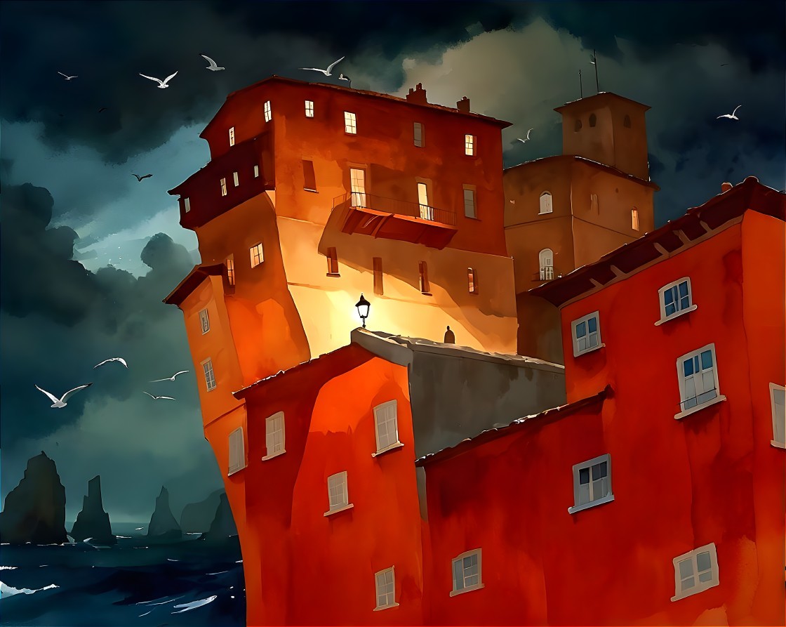A stylized painting of brightly colored, close-packed buildings on a cliff overlooking a dark, stormy sea, with several white seagulls flying in the sky. The central building is a tall, reddish-orange structure with many windows, some of which are lit, and a small balcony. To the right,