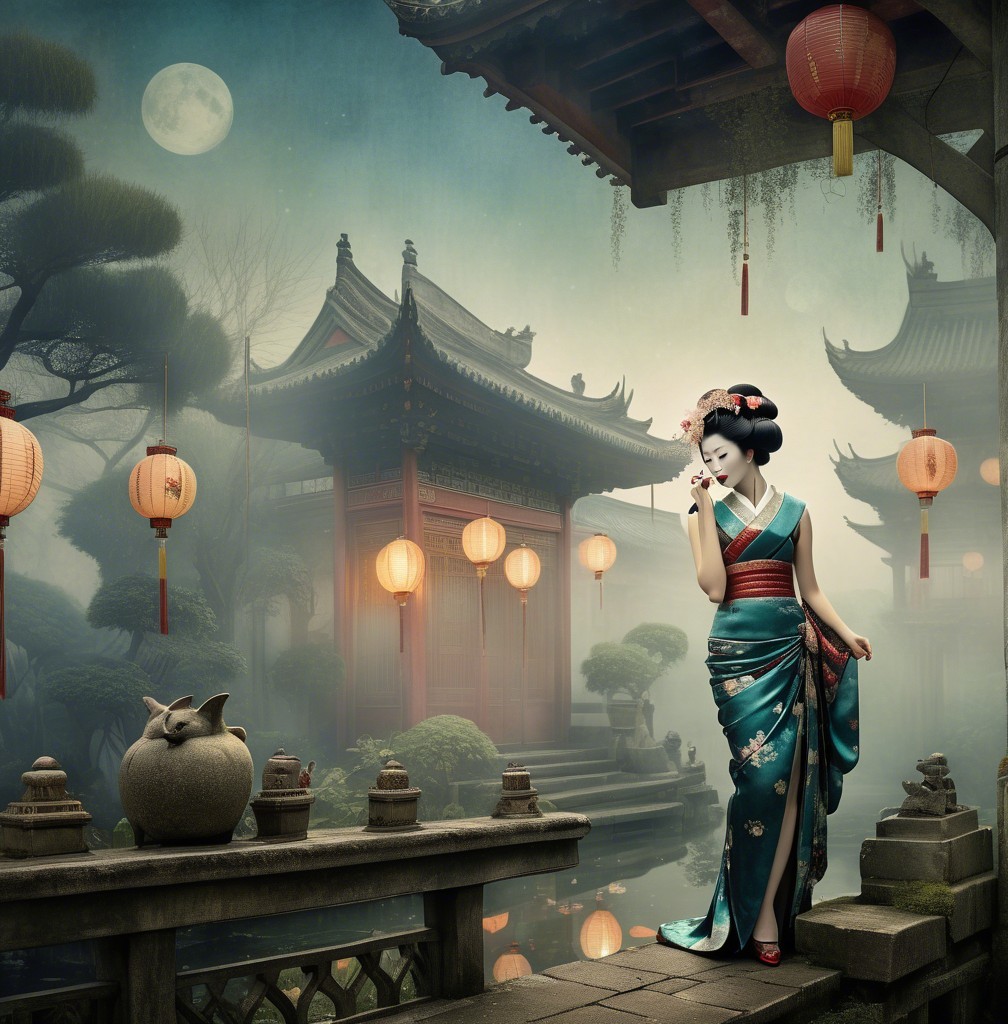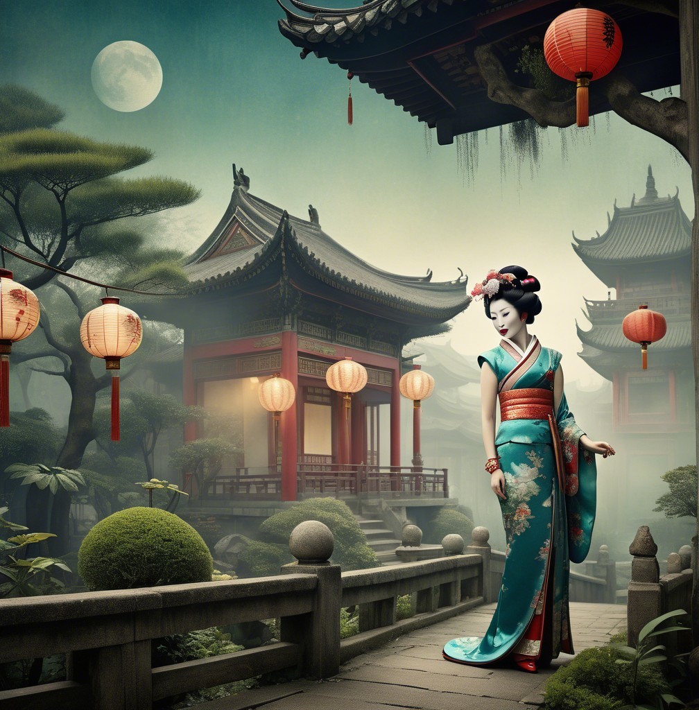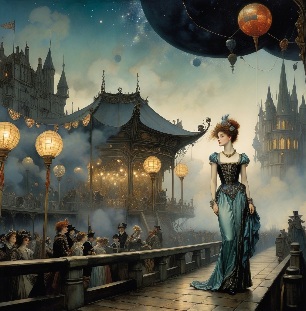 A fantastical scene set in a bustling fair. A woman in an elegant blue dress stands confidently, gesturing towards a carousel, surrounded by curious onlookers and whimsical architecture.