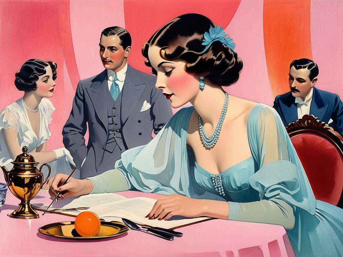 A glamorous woman in a vintage blue dress writes at a pink table, surrounded by elegant glassware and oranges, with a serene expression and a backdrop of soft pastel colors.