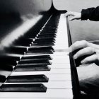 Two hands play a beautifully crafted piano, gracefully dancing over the glossy keys. The warm lighting highlights the intricate details of the instrument, creating an inviting atmosphere.