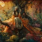 In a dimly lit room, a woman in a black dress sits on a bed draped with a red blanket. Soft lamps illuminate the cozy space adorned with personal touches and a serene atmosphere.