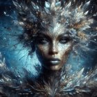 A striking close-up of a woman adorned with intricate, shimmering face makeup and elegant accessories, resembling nature's beauty. Her expressive eyes shine against a water-inspired backdrop.