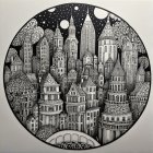 The image features a circular design filled with intricately drawn stained glass windows, surrounded by stars and a night sky. Each window showcases unique patterns and shapes, creating a whimsical scene.
