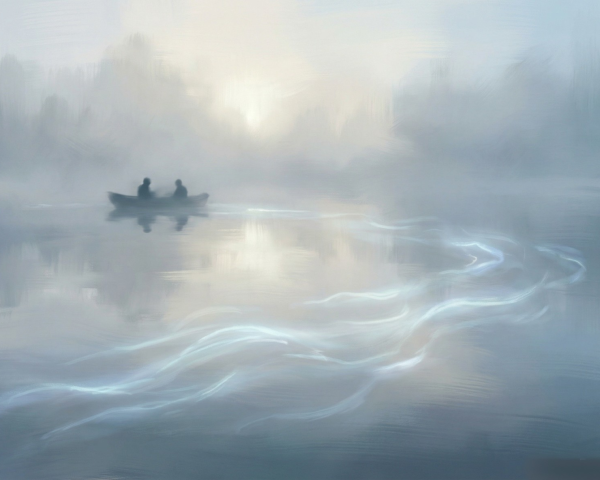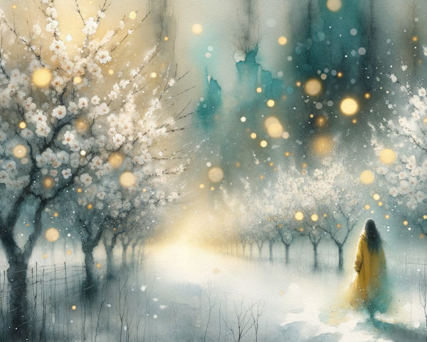 A serene, ethereal woman stands with flowing hair, her eyes closed in contemplation. The soft, dreamy background hints at a mystical atmosphere, enhanced by gentle light and blurred scenery.