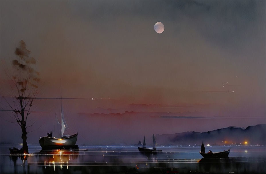 Harbor scene at dusk: boats, calm water, full moon, hazy background
