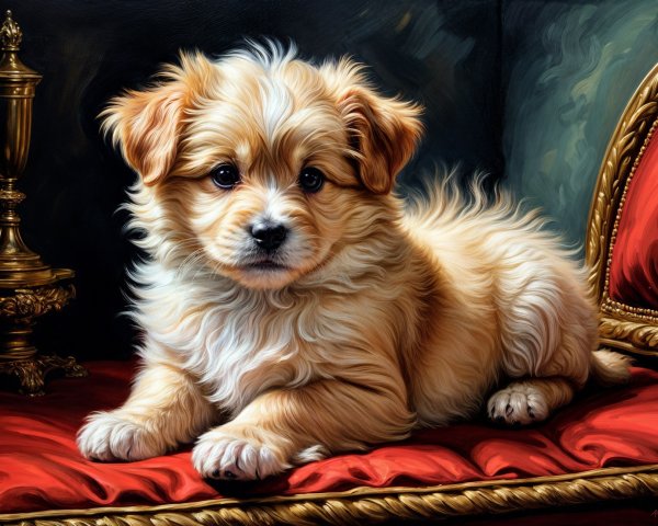 A fluffy dog rests on a snowy landscape, surrounded by tall pine trees. The serene scene features a cozy cabin in the background, illuminated by a warm, golden sunset.