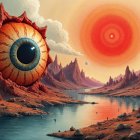 A surreal landscape features towering reddish mountains and a tranquil lake, with a massive, fiery eye at its center, casting an otherworldly glow over the serene environment at sunset.