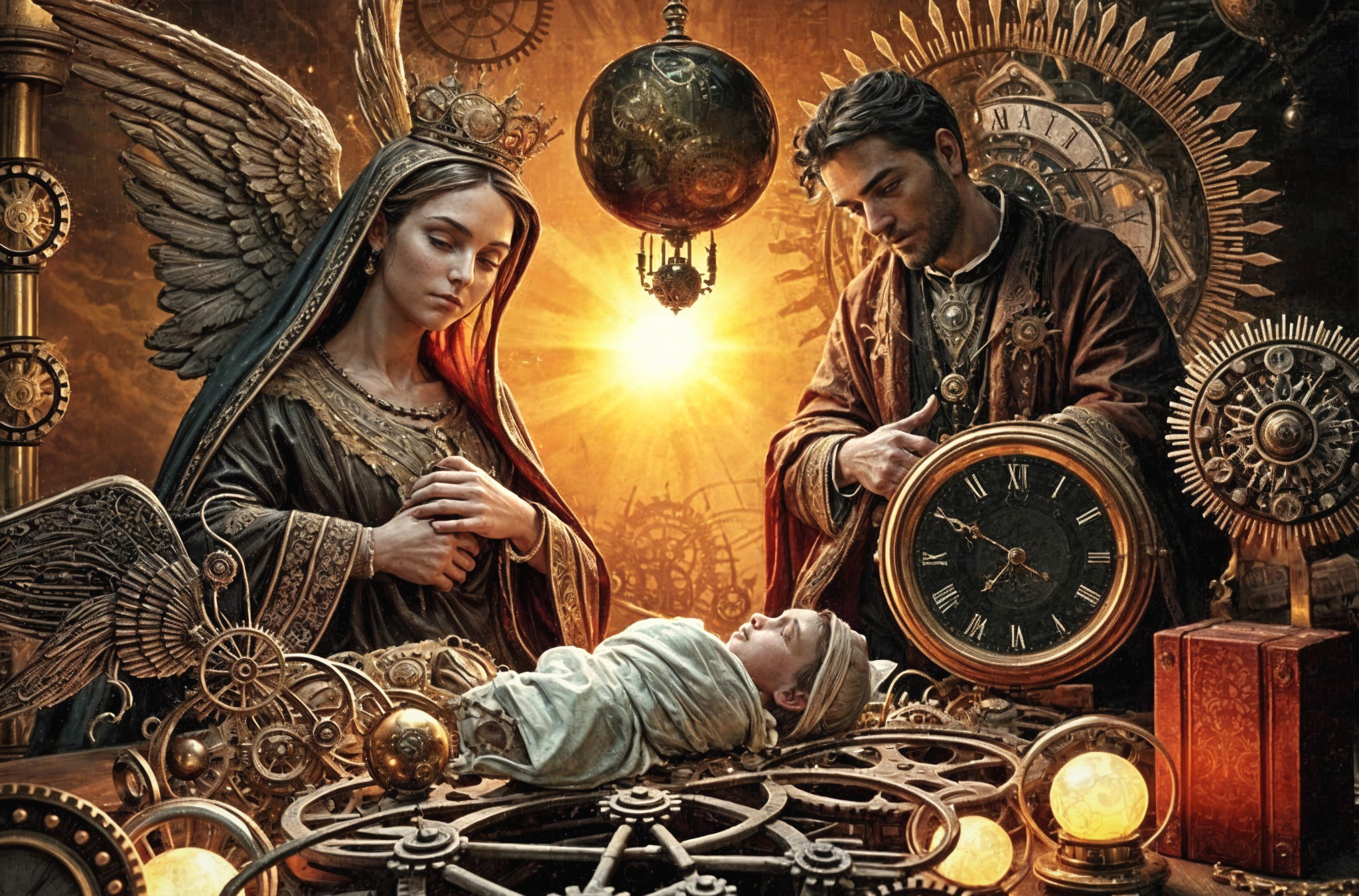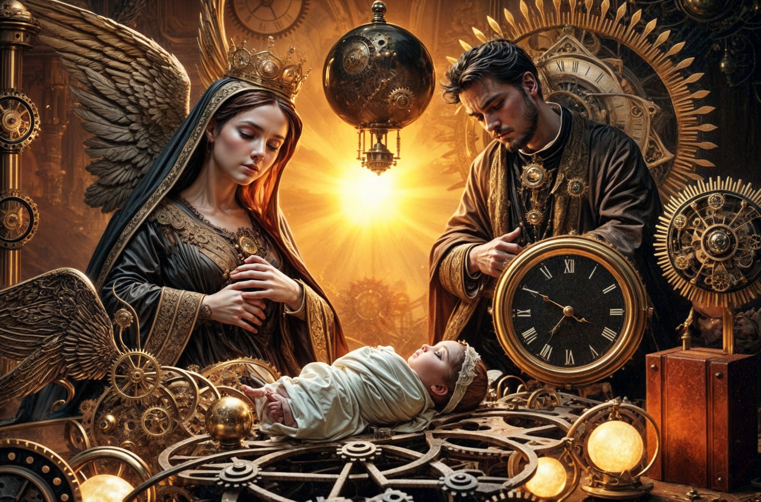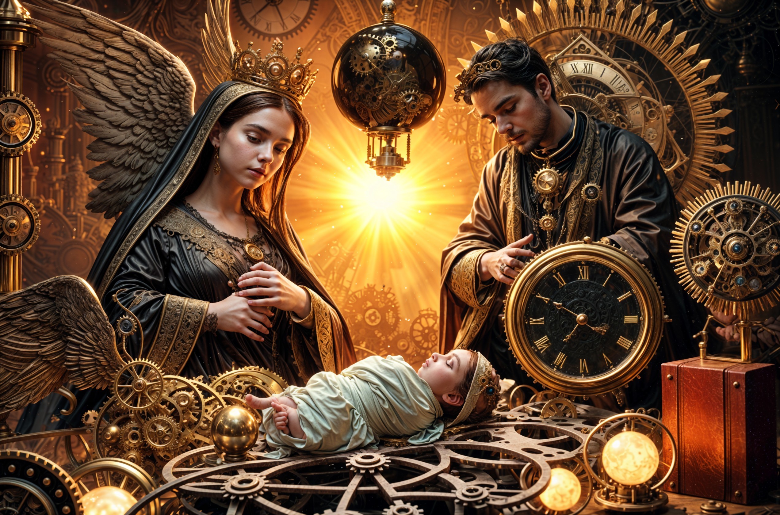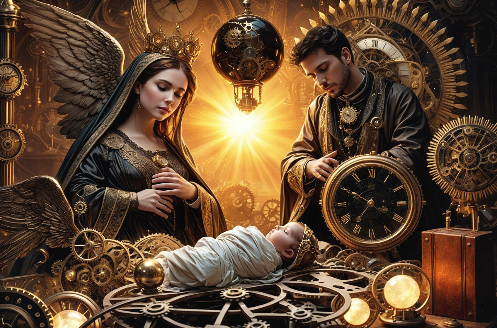 A serene scene features a woman in dark robes with angelic wings and a man in ornate clothing, both gazing lovingly at a swaddled baby. The backdrop is filled with intricate clockwork gears and golden light.