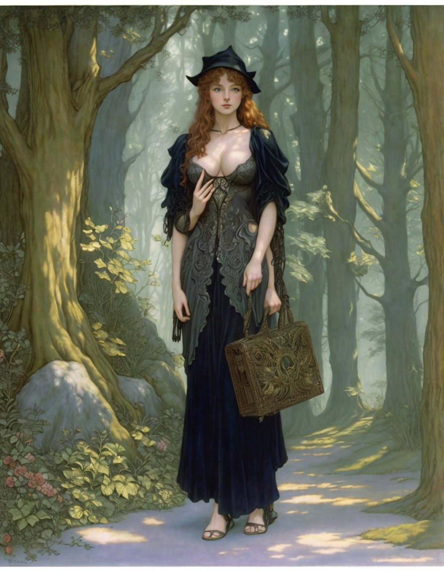 A woman stands elegantly in a flowing black dress, featuring a high slit and a cinched waist. Her hair cascades in waves, set against a softly lit, circular backdrop with intricate details.