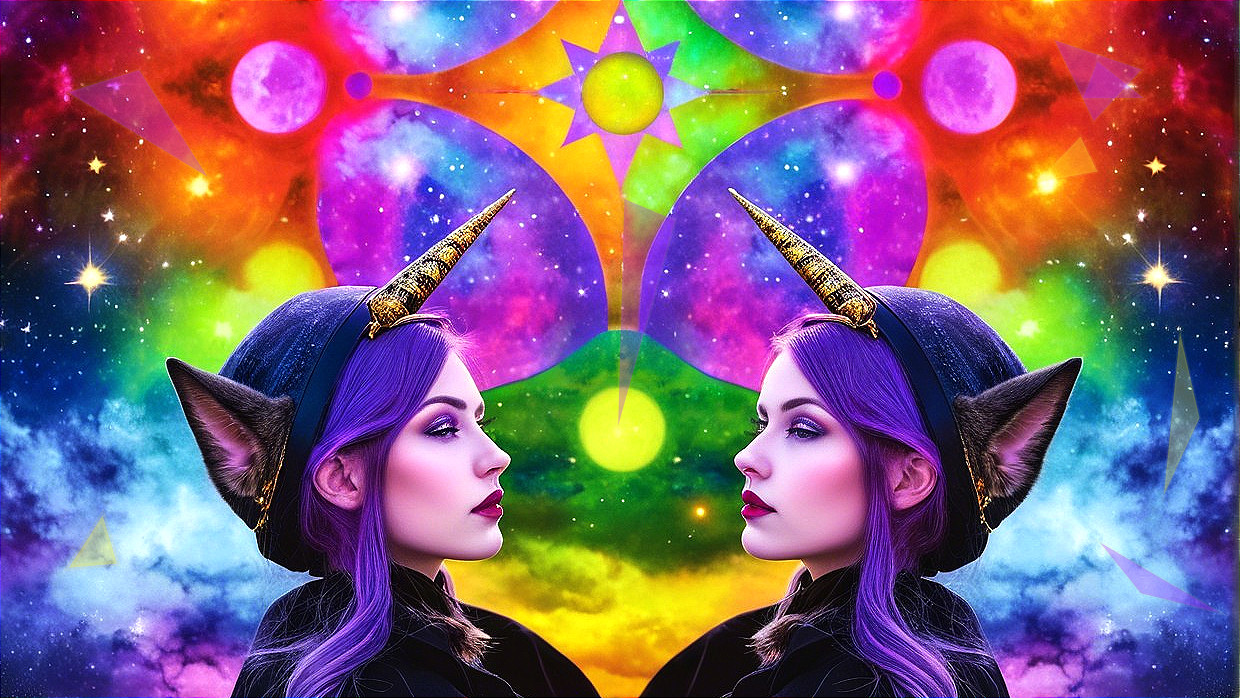 A vivid cosmic backdrop with twin mirror images of a person with purple hair and pointed ears, surrounded by stars and celestial bodies.