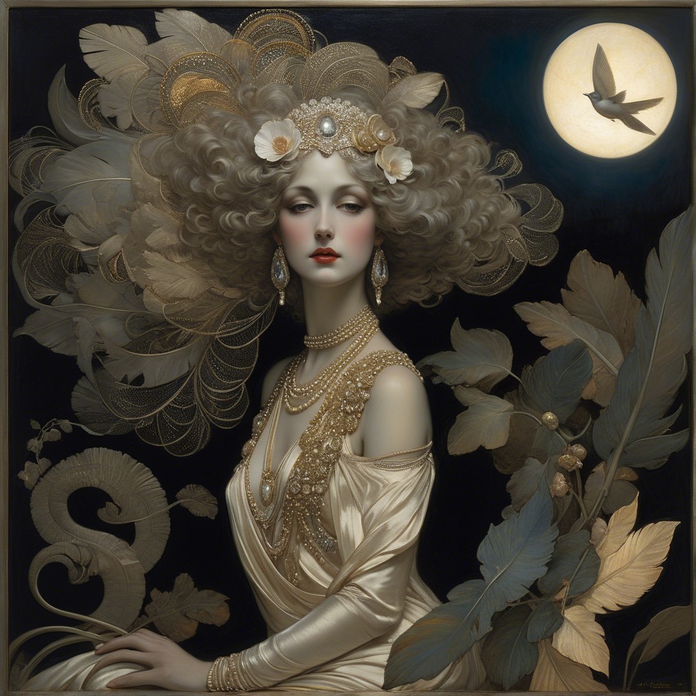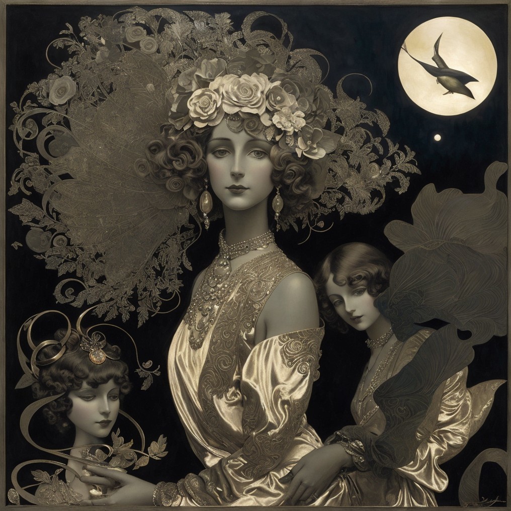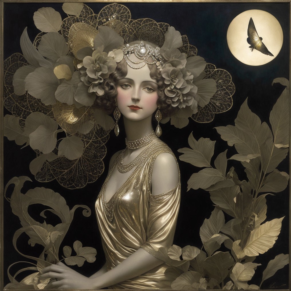 A stunning Art Deco portrait of a woman with curly hair adorned in an elegant gold dress and jewelry. She poses with a serene expression against a dark backdrop, featuring a full moon and swirling patterns.