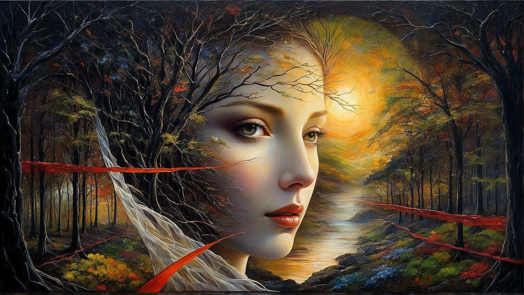 A surrealist painting blending a woman's face with an autumnal forest scene and a winding river reflecting a radiant sunset.