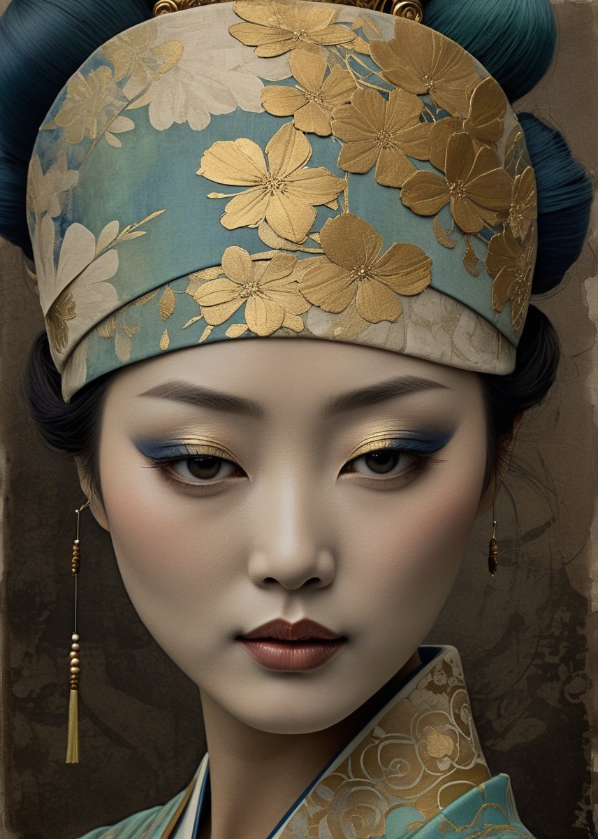 A captivating portrait of a woman in traditional attire, adorned with a floral-patterned headpiece and elegant earrings, featuring striking makeup that highlights her expressive eyes and serene expression.