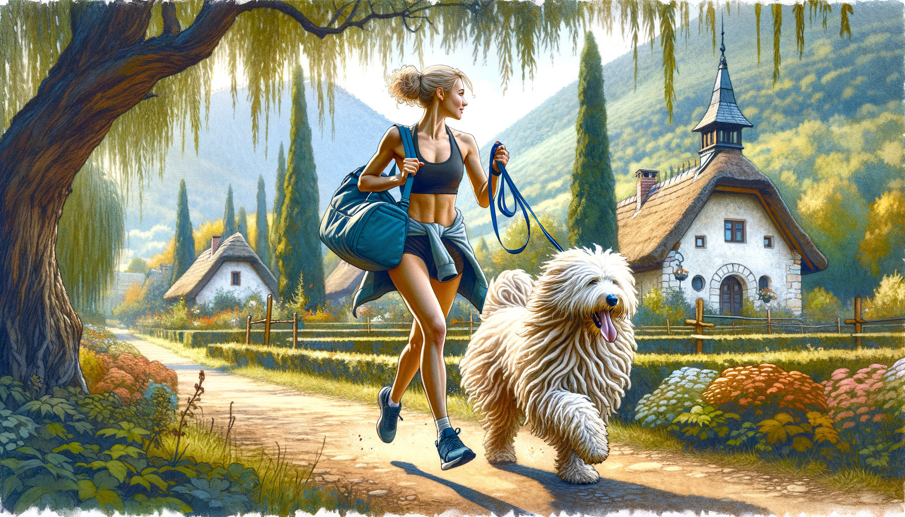 A vibrant watercolor and ink artwork depicting a woman with blonde hair jogging in a Hungarian village with her Hungarian Puli dog. The scene is detailed, colorful, and dynamic, capturing the essence of a charming village landscape.