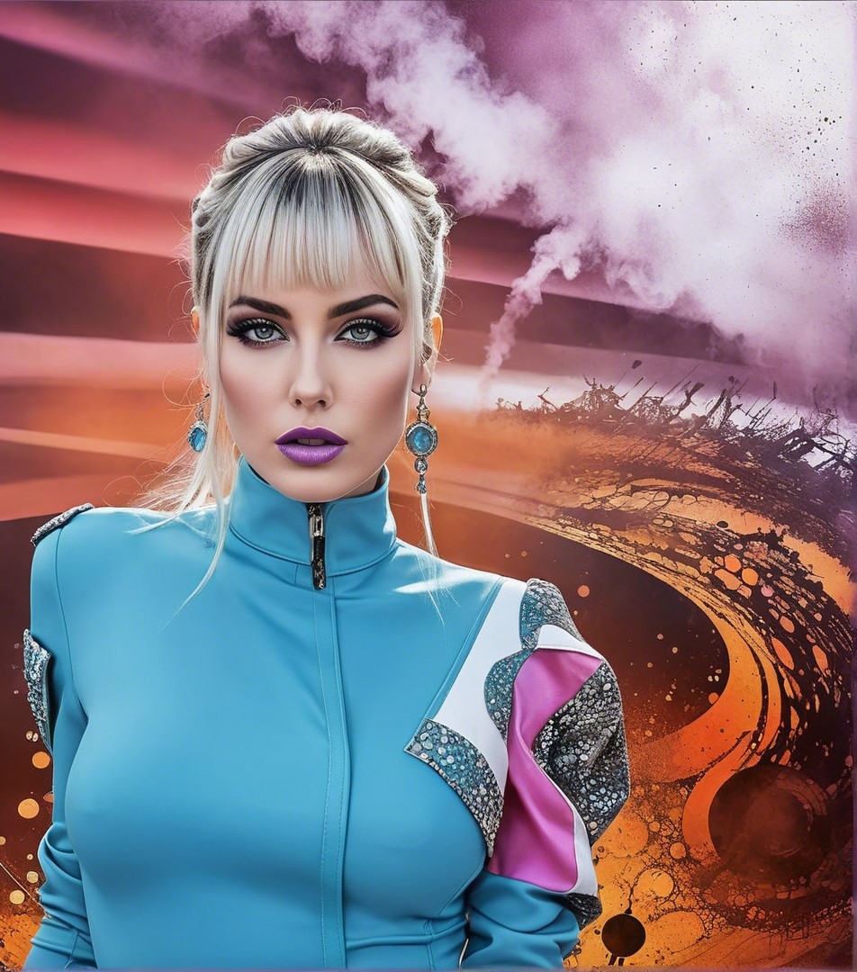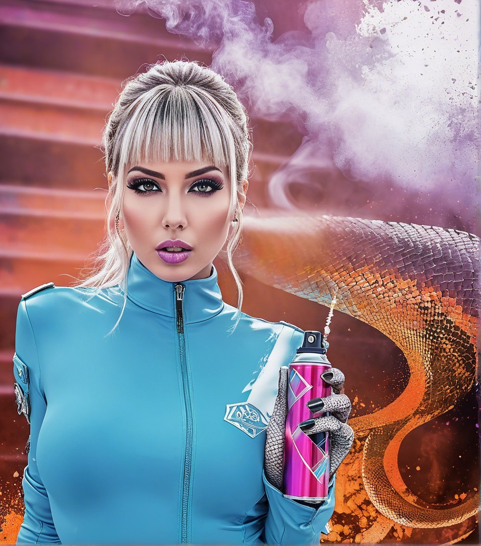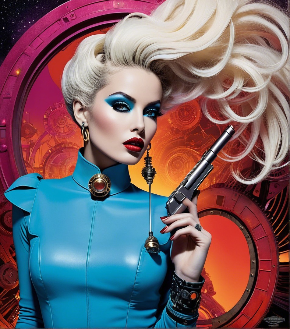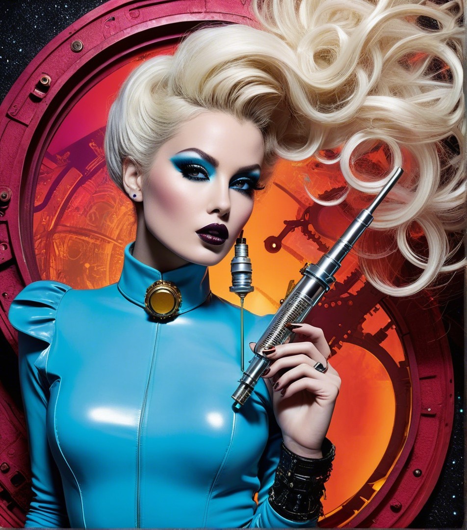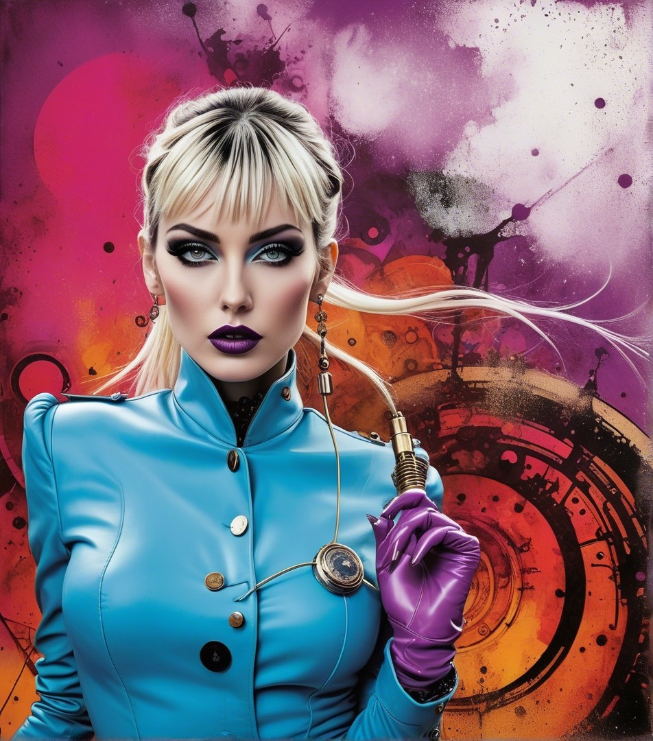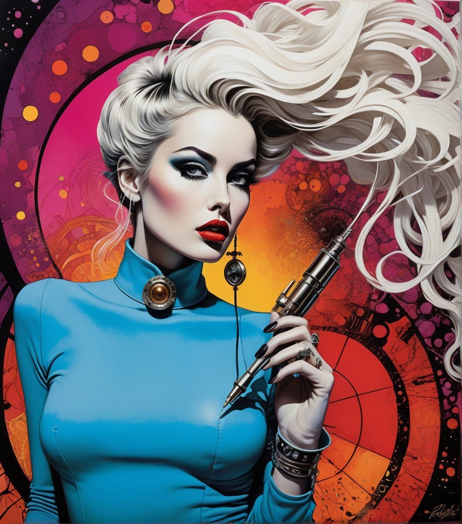 Prompt: Sultry femme fatale with a rebellious allure, She holds a large metallic Syringe, adorned in intricate stippled lineage details, against a backdrop of retrofuturistic sci-fi elements. The scene features a blend of psychedelic steampunk aesthetics with Ralph Steadman-inspired quirky designs and Yves Tanguy's surreal style. Imagine a Tim Burton-esque character fusion of dark whimsy, Pop Art, and academic art, set in a futuristic gothic environment with luminism techniques. lighting by Hilma af Klint, coloring by Dean Ellis, split toning by Man Ray, color (decalcomania), line-art details,high coloring, flares, flecks, shapes, triadic color scheme silver-grey, beige lilac, serene Gothic woman, smirky smile, textured with hatching details full-width papercut, featuring a beautiful and detailed scenery. Focus on creating an illusion of flowing hair with sculpted bas-relief effects, incorporating metallic colors and an extremely colorful palette. Infuse traumacore whiffs for a dark Gothic twist, ensuring crisp quality and HDR. The composition bursts with vibrant primary colors, reminiscent of Henri Matisse's palette, and incorporates cel-shaded elements and dynamic geometrical patterns. The character embodies a rebellious spirit, holding a spray can, against a backdrop of graffiti and zentangle patterns by Paul Kidby and Ernst Haeckel, with lineage details reminiscent of John Heartfield's political satire, honoring surrealism in the vein of Bridget Bate Tichenor, with a touch of psychosomatic surrealism. Incorporate a color glitch effect, precise pen and ink detailing, and a hypotrochoid theme for mathematical artistry. The style should pay homage to Alex Grey, Andy Warhol, and Ernst Ludwig Kirchner, blending their influences seamlessly. Capture a rebellious and vibrant atmosphere with expressive brush strokes, blurred features, and emotional intensity. Utilize dynamic composition, abstracted forms, textured layers, and fluid lines with unconventional angles to enhance