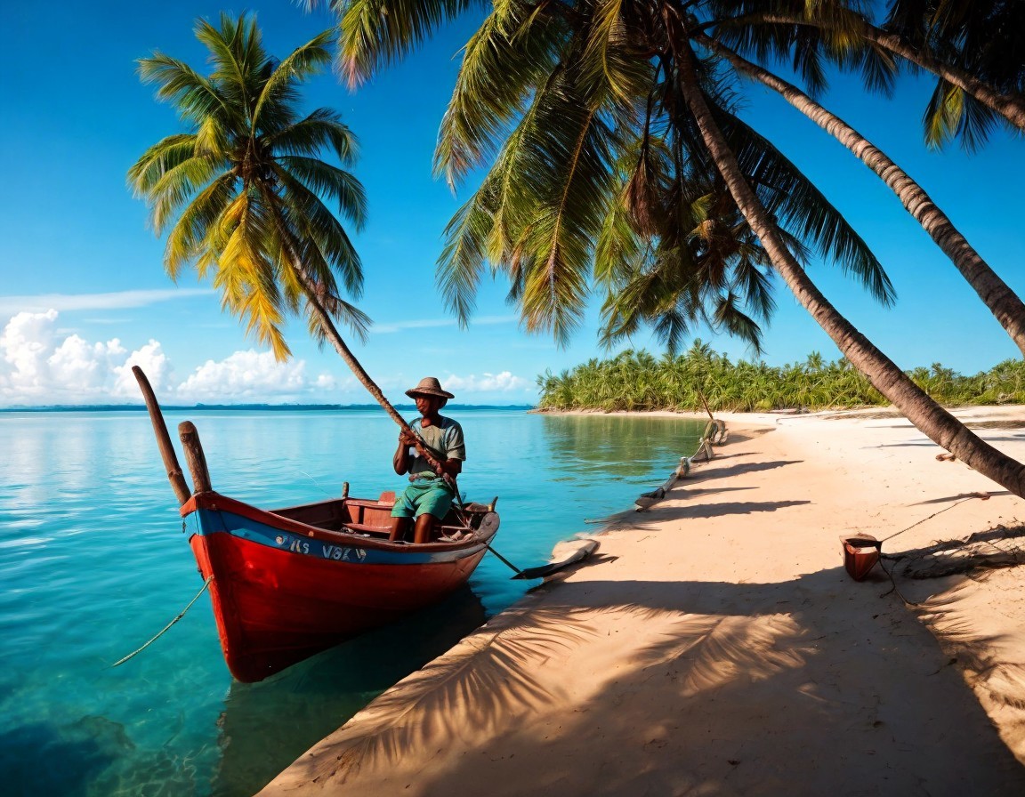 Fisherman in hat on red boat by wooden dock, palm trees, blue skies