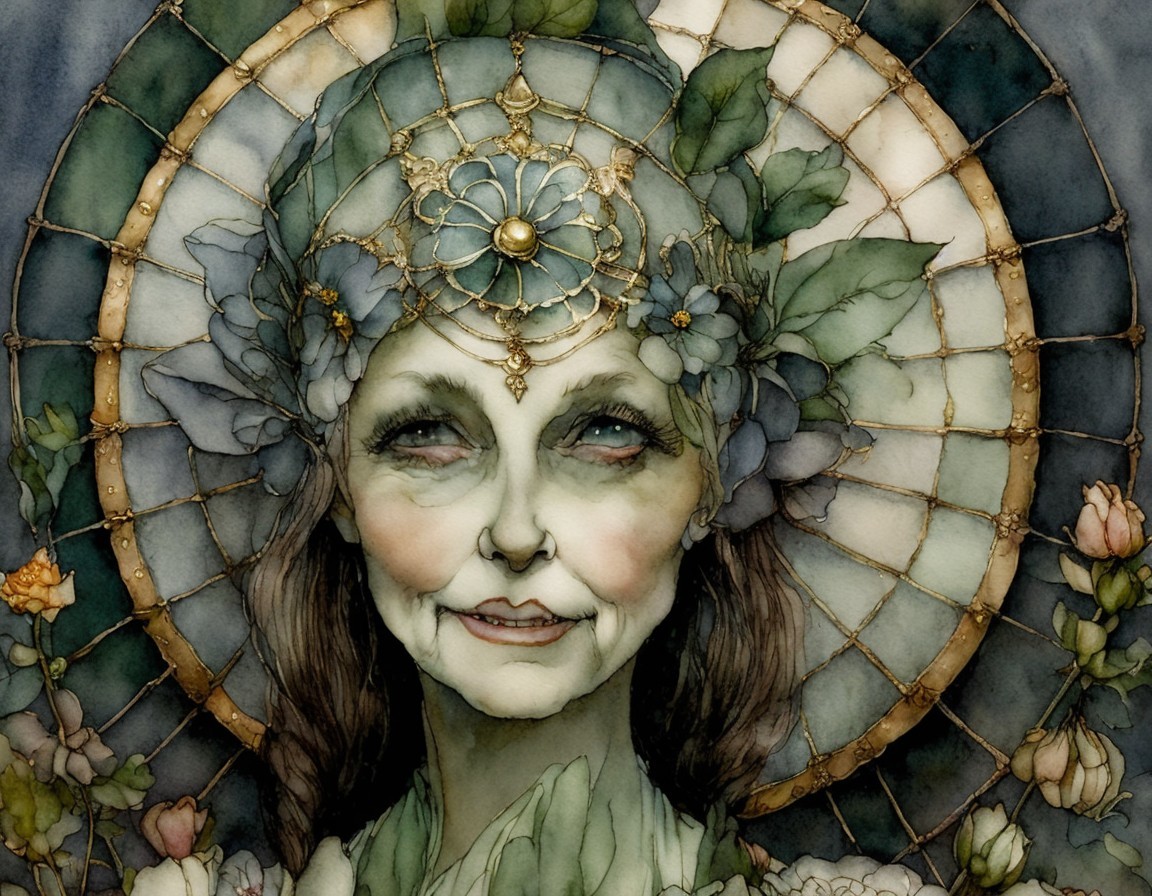 A serene elderly woman with silver hair, adorned with a floral headdress and a necklace. She smiles gently, framed by a circular stained-glass backdrop featuring soft colors and floral accents.