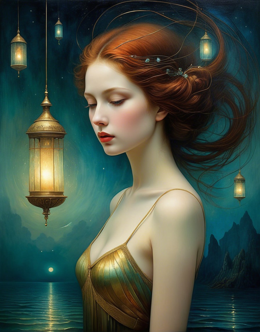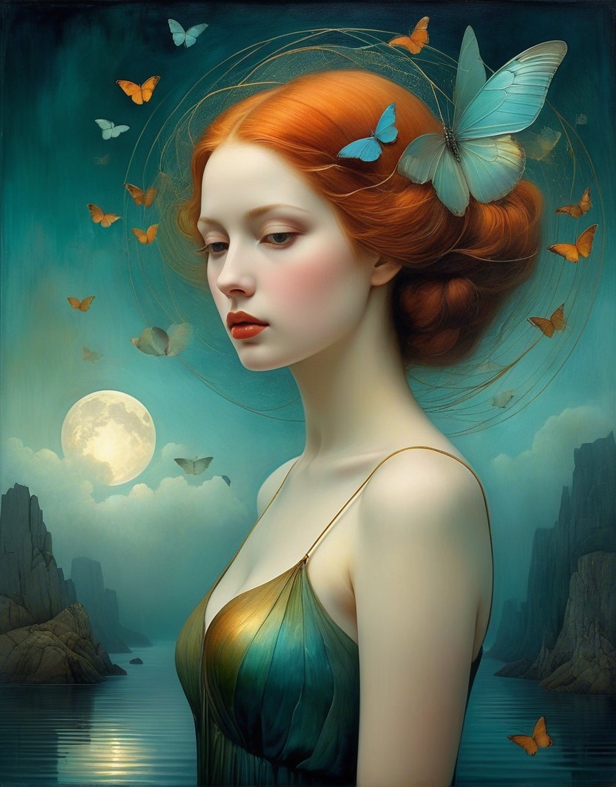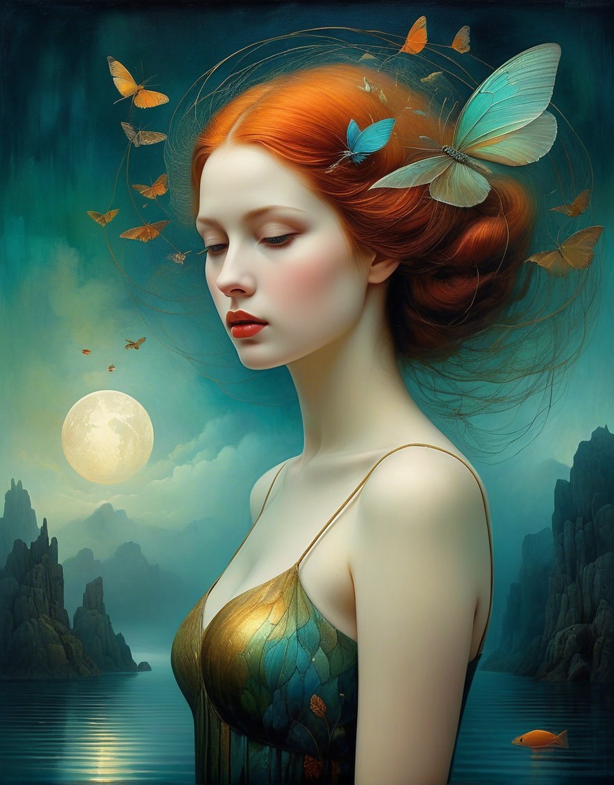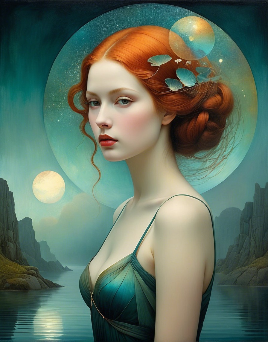 A ethereal woman with flowing red hair gazes serenely, adorned with leaves. The backdrop features a tranquil moonlit scene with a ship and forested hills, blending fantasy and beauty.