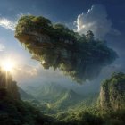 A vibrant, floating island features a massive, lush tree atop, surrounded by colorful clouds and serene waters. Sunlight beams down, illuminating a harmonious blend of nature and tranquility.