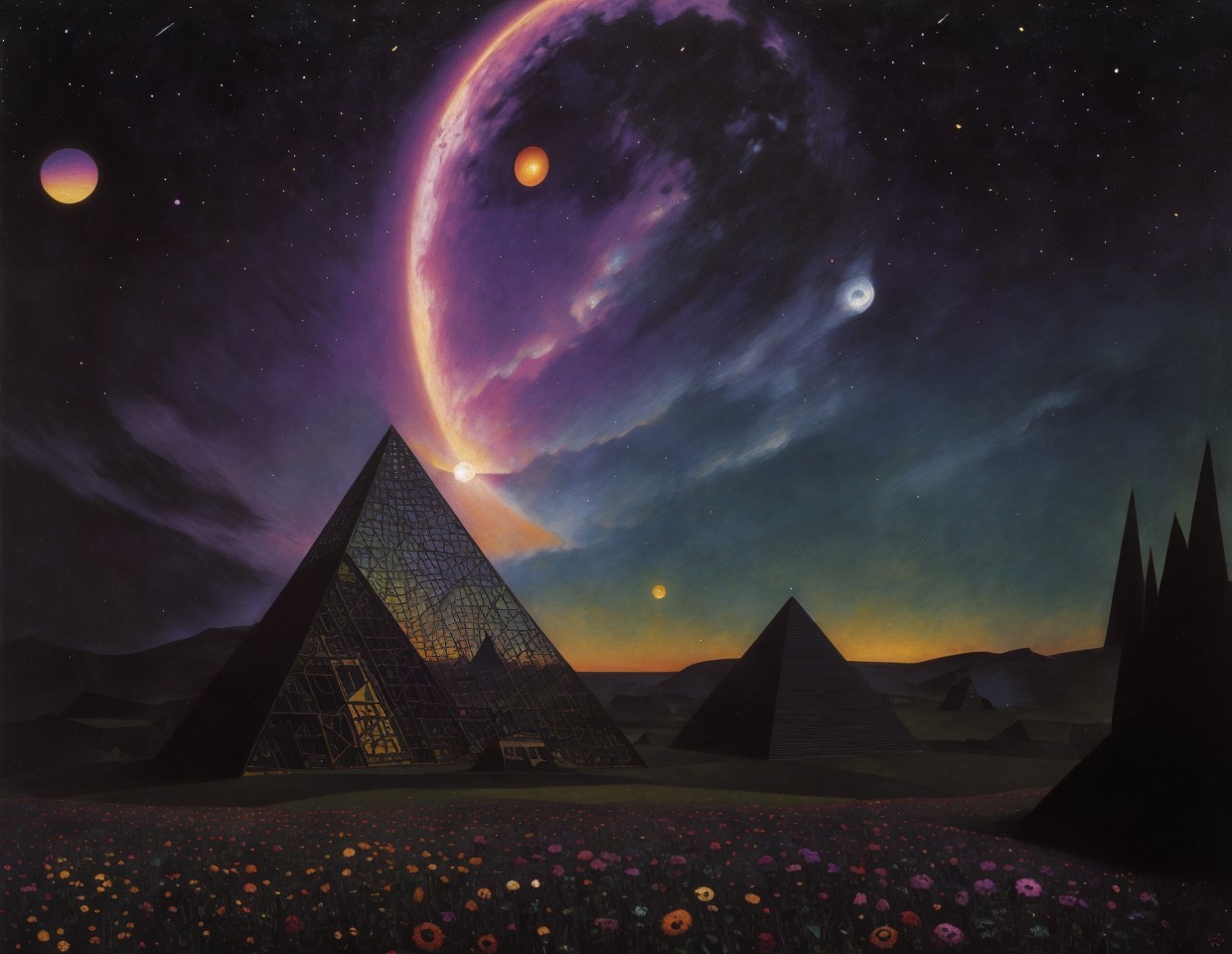 SURREALISM , sunset psychedelic colors. mechanical eye pyramid in field, sunset where the sun behind pyramid, cosmic sky background, photorealism, magical, small extra details by Dave McKean and Paul Klee. some flowers and plant by Gustav Klimt.