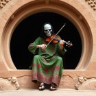 A featureless mannequin in a green suit sits in a round stone alcove, playing a violin. Its surroundings are earthy and natural, creating a striking contrast with the figure's smooth appearance. ¯\_(⊙_ʖ⊙)_/¯
