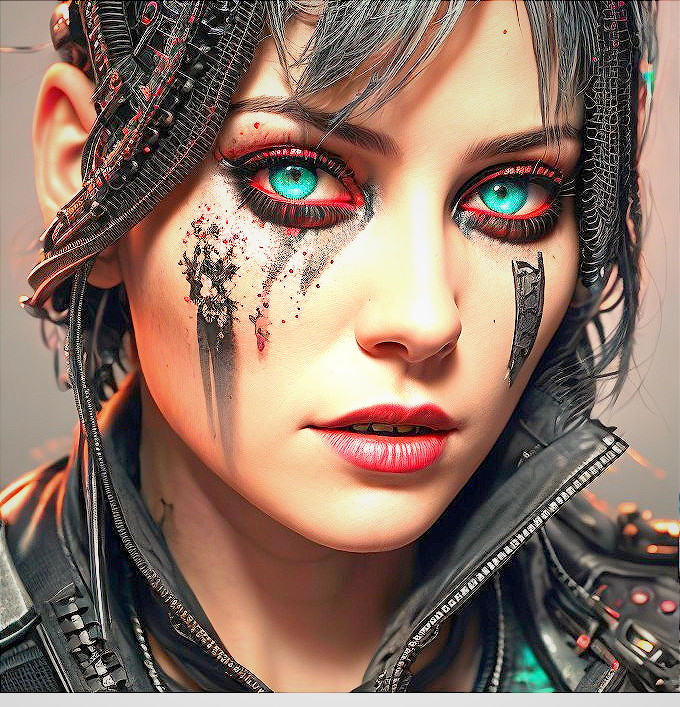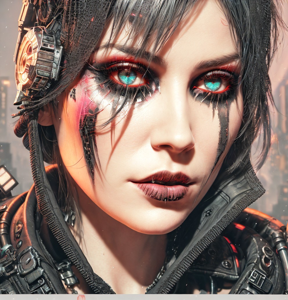 Headshot, Grunge, ,Horrorpunk, intricate cyberpunk details, beautiful contraptions, ultra detailed, high definition, stacked up perspective. 3d effects, shadow mapping, dynamic lighting 1.7, ambient occlusion 1.5, anisotropic filtering, brightness 1.4, She is centered in a sinister apocalyptic surrounding, a fantastical dystopian background, Space age style, gothical psychpomp, grunge, blending string art, gloss, shimmering beadwork, intricate technical features, emphasized chiaroscuro contrasts and incorporating subtle hues, acid spill, dreamy, alcoholic ink, gouache, inkpunk 1.8, stylized lineage hairdo, auracore 1.7, wicked eyes, 3d effects 1.8, detailed textures, chipped, dynamic lighting 1.7, anisotropic filtering 1.7, auracore, anhlo gothic 1.7, ambient occlusion 1.5, raytraced shadows 1.8, (( high coloring 1.9, bokeh effects, (muted colors of beige and auburn, contrast colors, limited palette,) silhouette-like, stylized illustration), complexion, plasticity 1.4, intricate ornamental details 1.9) 8:5), digital stylized illustration, fashion photography,, stacked-up perspective, cuteness 0.7, embossed strokes, colorful reflections, lavish, dark fantasy art 1.4, octane render illustration 1.5, tints of 1970s advertising art, vector 9:5, eroticism, seductive,