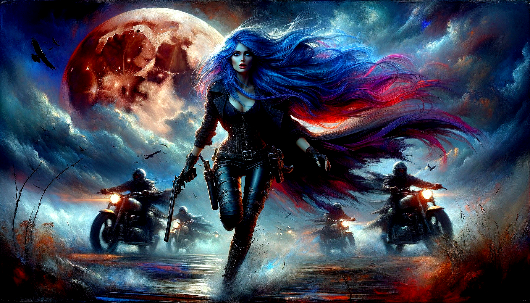 A stunning digital painting featuring a European warrior woman with blue hair, holding a hunting gun, fleeing from motorcycle-riding savage barbarians under a blood moon. The artwork showcases high-speed dynamism and intricate details in an epic fantasy setting.