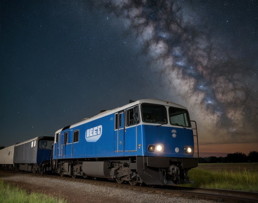 A blue train engine stands on tracks under a stunning night sky filled with stars and the Milky Way, creating a striking contrast between the train and the cosmic backdrop.