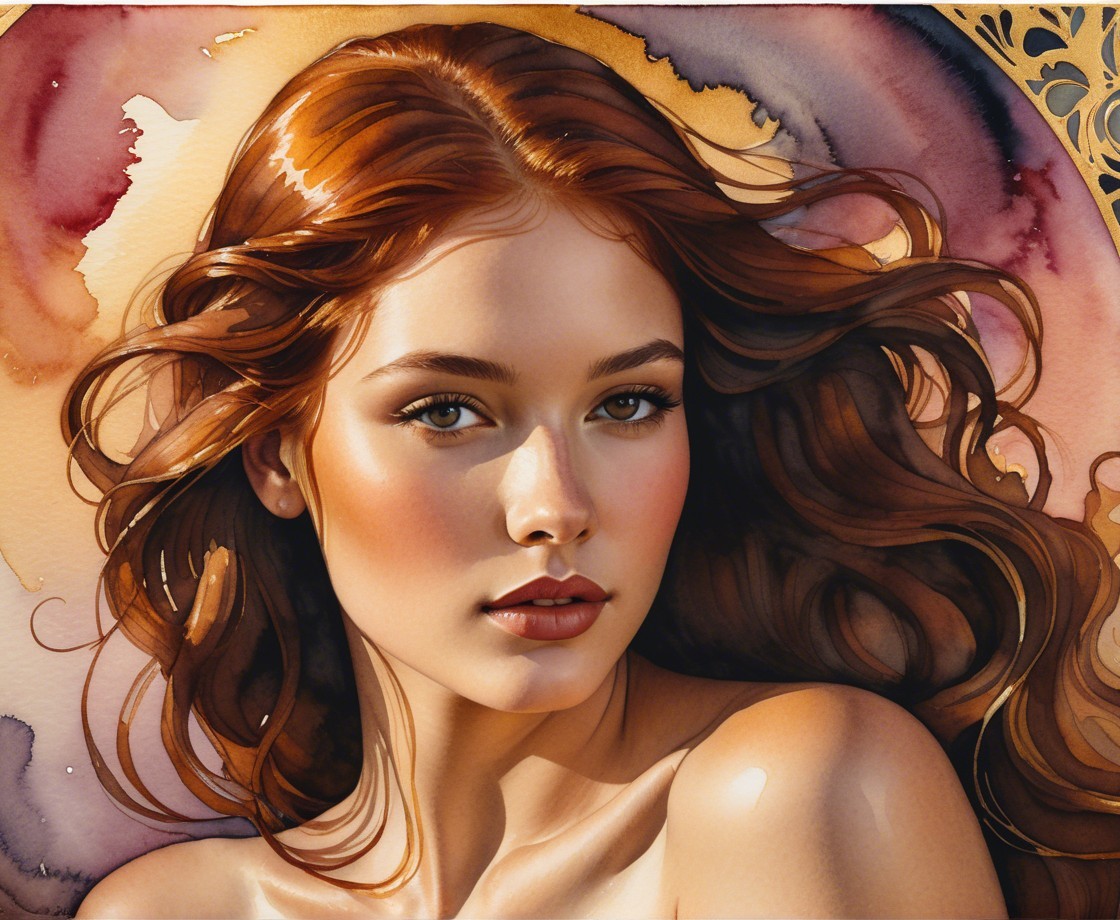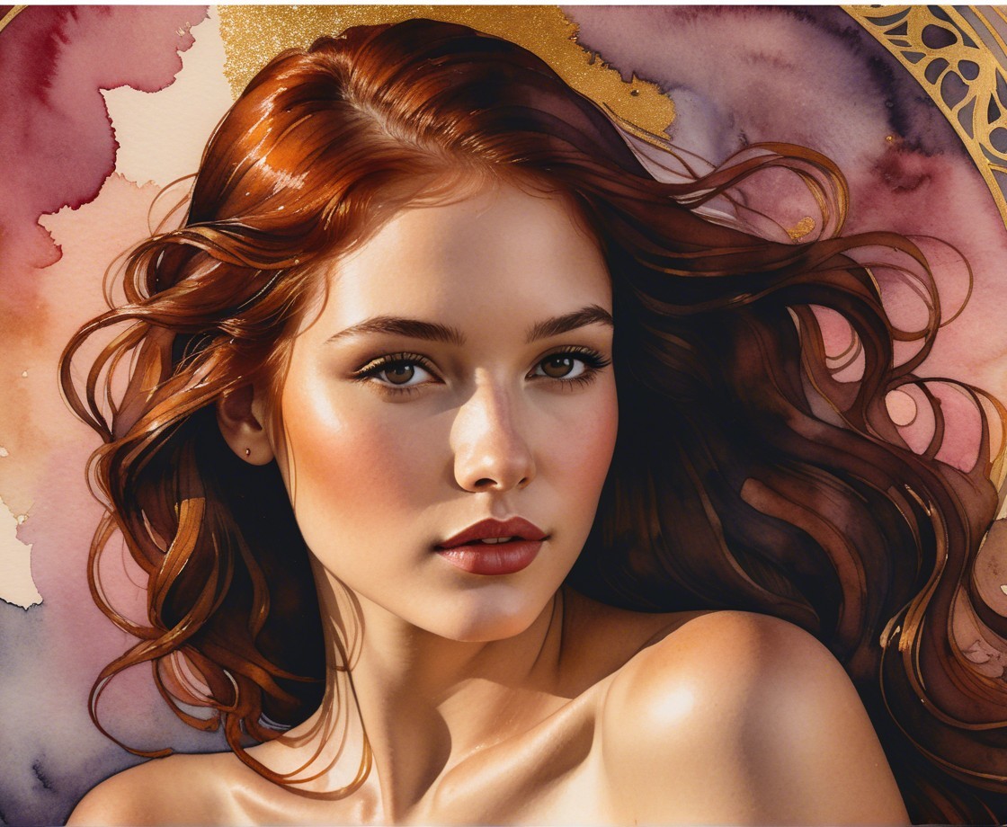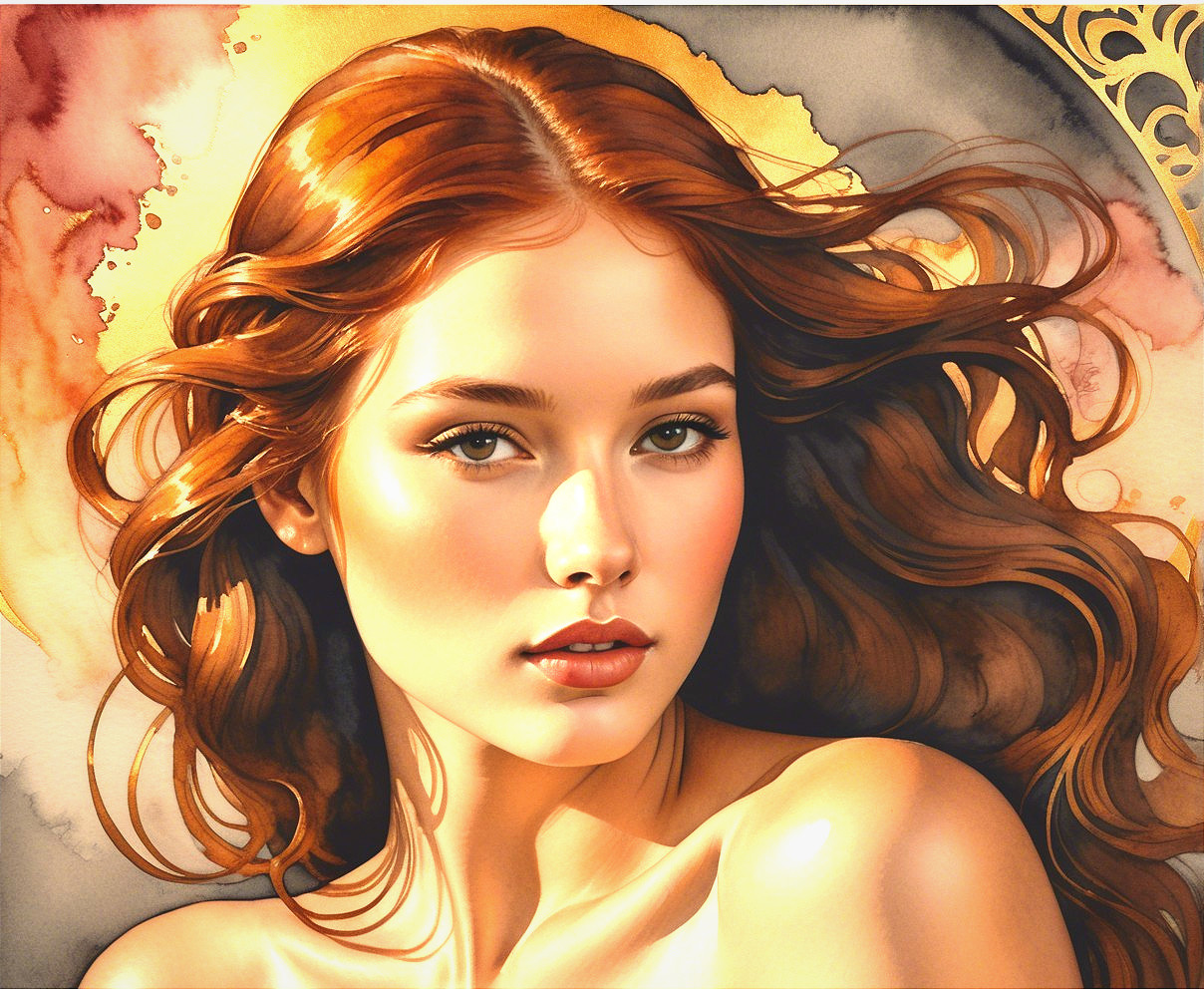 Prompt: Sensual portrait in an expressive Art Nouveau fashion illustration style, gold painting, using thinned and watery watercolor and ink. A beautiful juvenile woman with long, flowing auburn hair rendered with sinuous, soft watercolor washes, delicate ink details, Art Nouveau elegance, high-resolution clarity of the artistic texture against a dark gray background and gradient, a surreal illustrationand decorative beauty. The background is glossy, contoured outlines, plasticity 1.3, subsurface scattering 1.3, 3d effects. Organic, flowing decorative cateries and line-art arrangements. Angled view, delicate casted shadows in grey-black, asymmetrical flowing gold ink lines and soft washes of iridescent watercolor slick effect, layered, translucent washes of warm auburn and dark-pink watercolor, adorned with intricate gold ink, dyed, cel-shaded orphism featuring geometrical 3D effects, nuanced, impossible light transitions by Brock Hofer merged with retro-futurism and american gothic, collagraphy, great depth and scale, tousled, opaque delicate tones in line-agraceful, flowing, warm milky tones, opaque features, elegant curves, looking serenely, watercoloring with a soft wash of rose-red.jewelry suggested by delicate gold ink patterns on her skin. Dynamic warm lighting implied by the light and shadow in the watercolor washes. This work emphasizes flowing lines, organic forms, blurring the ornate background and focusing sinuous ink linework,quivering texture resembling aged parchment paper with faint, swirling ink washes of pale brown and cream, contrasting the rich outfit colors,depth of field, scuffed-worn-scratched surface, organic ink lines and warm watercoloring. Ink flares and washes. Her oiled skin is depicted with delicate watercoloring, watercolor washes, catenaries, emulsion shifts, sculpted, cel-shaded, highlighted with fine gold ink, resin-like texture, oil, alcoholic ink, citrine, contoured watercolor outlines,
