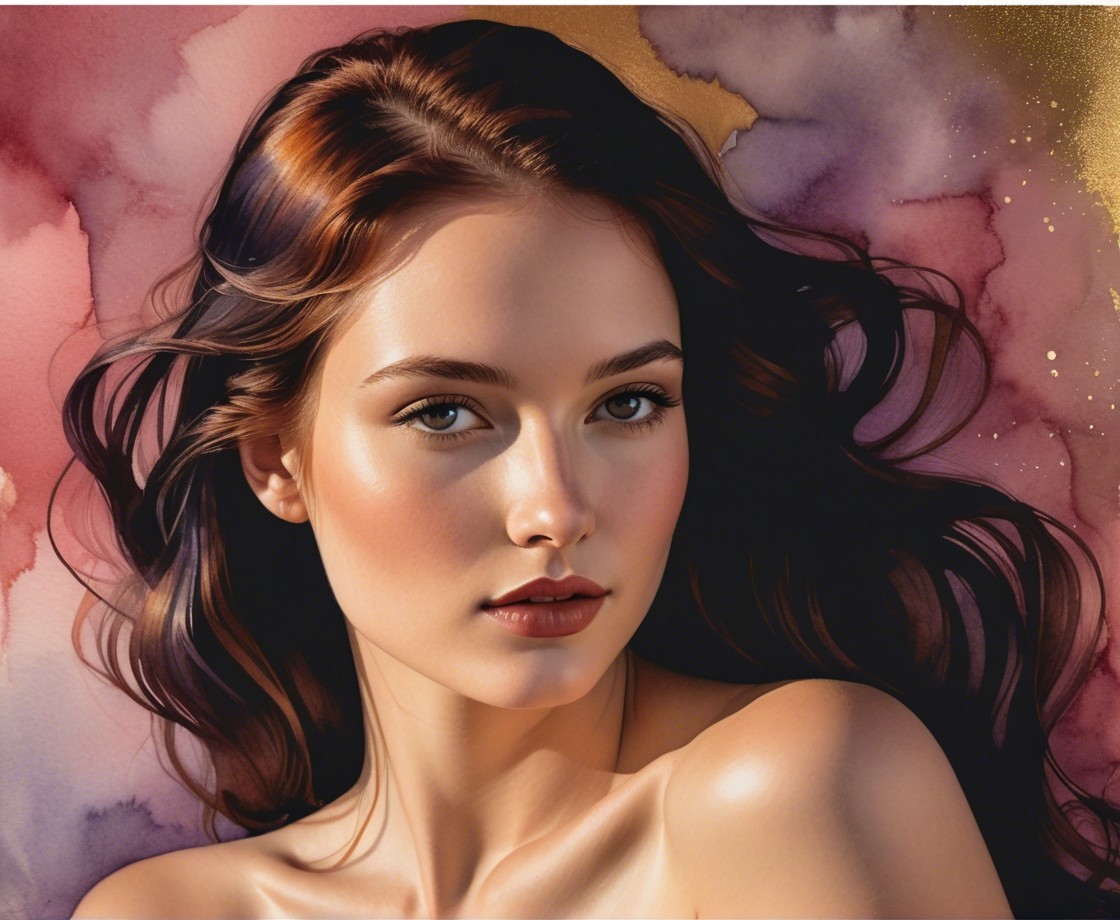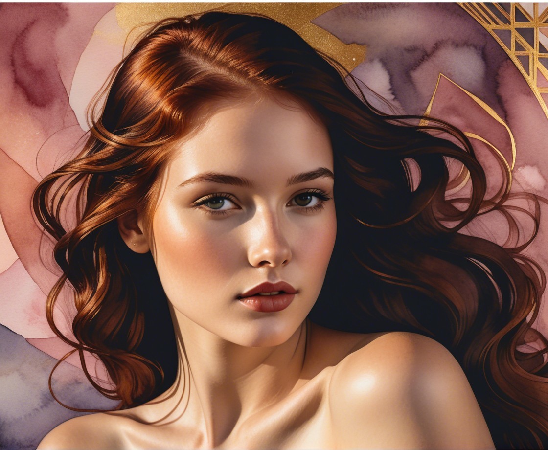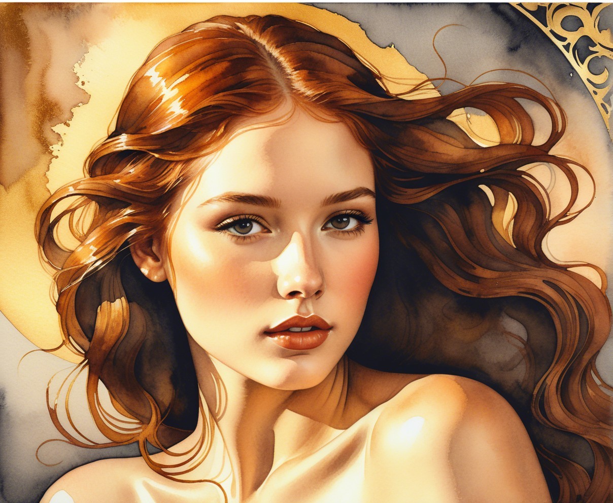 Prompt: Sensual portrait in an expressive Art Nouveau fashion illustration style, gold painting, using thinned and watery watercolor and ink. A beautiful juvenile woman with long, flowing auburn hair rendered with sinuous, soft watercolor washes, delicate ink details, Art Nouveau elegance, high-resolution clarity of the artistic texture against a dark gray background and gradient, a surreal illustrationand decorative beauty. The background is glossy, contoured outlines, plasticity 1.3, subsurface scattering 1.3, 3d effects. Organic, flowing decorative cateries and line-art arrangements. Angled view, delicate casted shadows in grey-black, asymmetrical flowing gold ink lines and soft washes of iridescent watercolor slick effect, layered, translucent washes of warm auburn and dark-pink watercolor, adorned with intricate gold ink, dyed, cel-shaded orphism featuring geometrical 3D effects, nuanced, impossible light transitions by Brock Hofer merged with retro-futurism and american gothic, collagraphy, great depth and scale, tousled, opaque delicate tones in line-agraceful, flowing, warm milky tones, opaque features, elegant curves, looking serenely, watercoloring with a soft wash of rose-red.jewelry suggested by delicate gold ink patterns on her skin. Dynamic warm lighting implied by the light and shadow in the watercolor washes. This work emphasizes flowing lines, organic forms, blurring the ornate background and focusing sinuous ink linework,quivering texture resembling aged parchment paper with faint, swirling ink washes of pale brown and cream, contrasting the rich outfit colors,depth of field, scuffed-worn-scratched surface, organic ink lines and warm watercoloring. Ink flares and washes. Her oiled skin is depicted with delicate watercoloring, watercolor washes, catenaries, emulsion shifts, sculpted, cel-shaded, highlighted with fine gold ink, resin-like texture, oil, alcoholic ink, citrine, contoured watercolor outlines,
