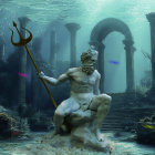 A majestic underwater scene features a large statue of a muscular figure sitting on a rock, holding a trident. Sunlight beams illuminate ancient ruins and colorful fish swim around vibrant coral.