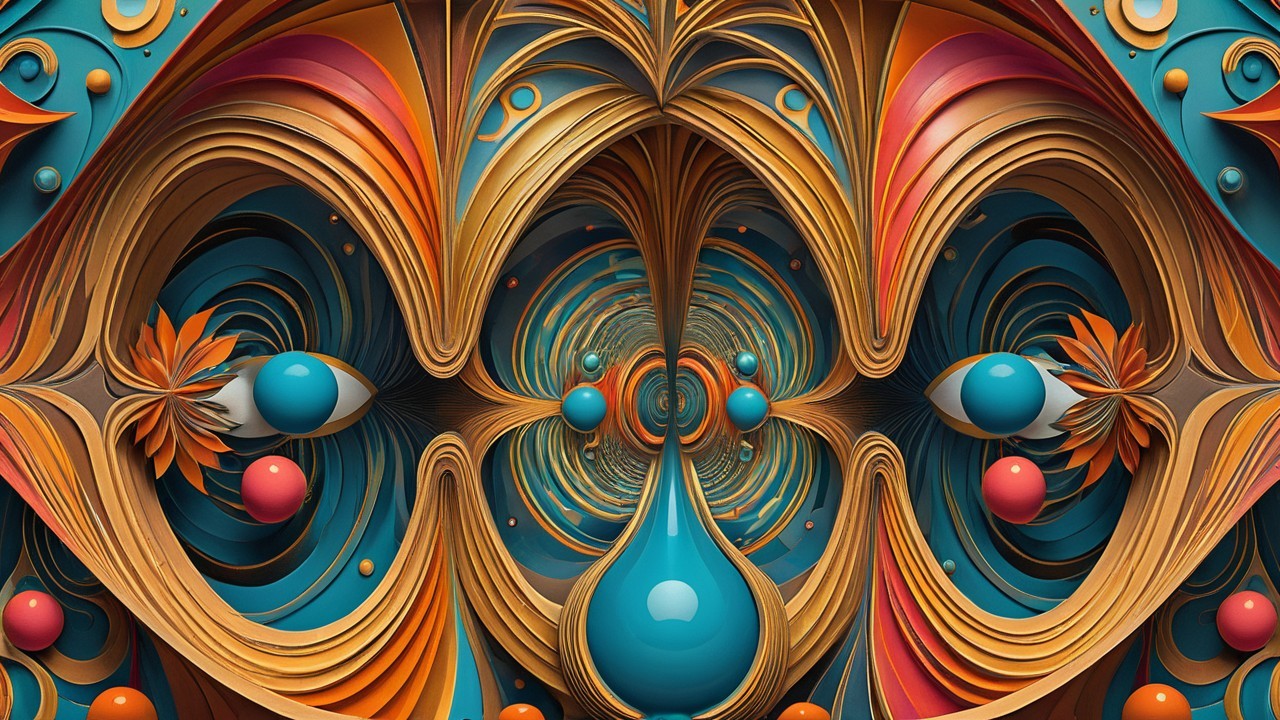 The image features a vibrant abstract design with swirling patterns in shades of purple, turquoise, and blue. Elements resemble eyes and fluid forms, creating an otherworldly, cosmic effect.