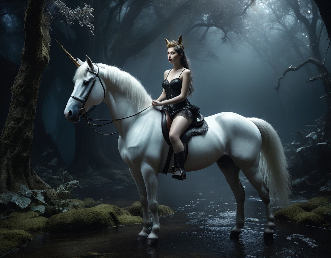 Prompt: "dark fantasy atmosphere of girl on unicorn,hauntingly beautiful,glow from ethereal fog,liquid hues blending with shadows;stunning visuals,highly detailed,8k resolution,create depth,imaginative elements;surreal aesthetics,cinematic lighting,by Joel-Peter Witkin,whimsical fantasy art,playful yet mysterious,immersive experience,high resolution"